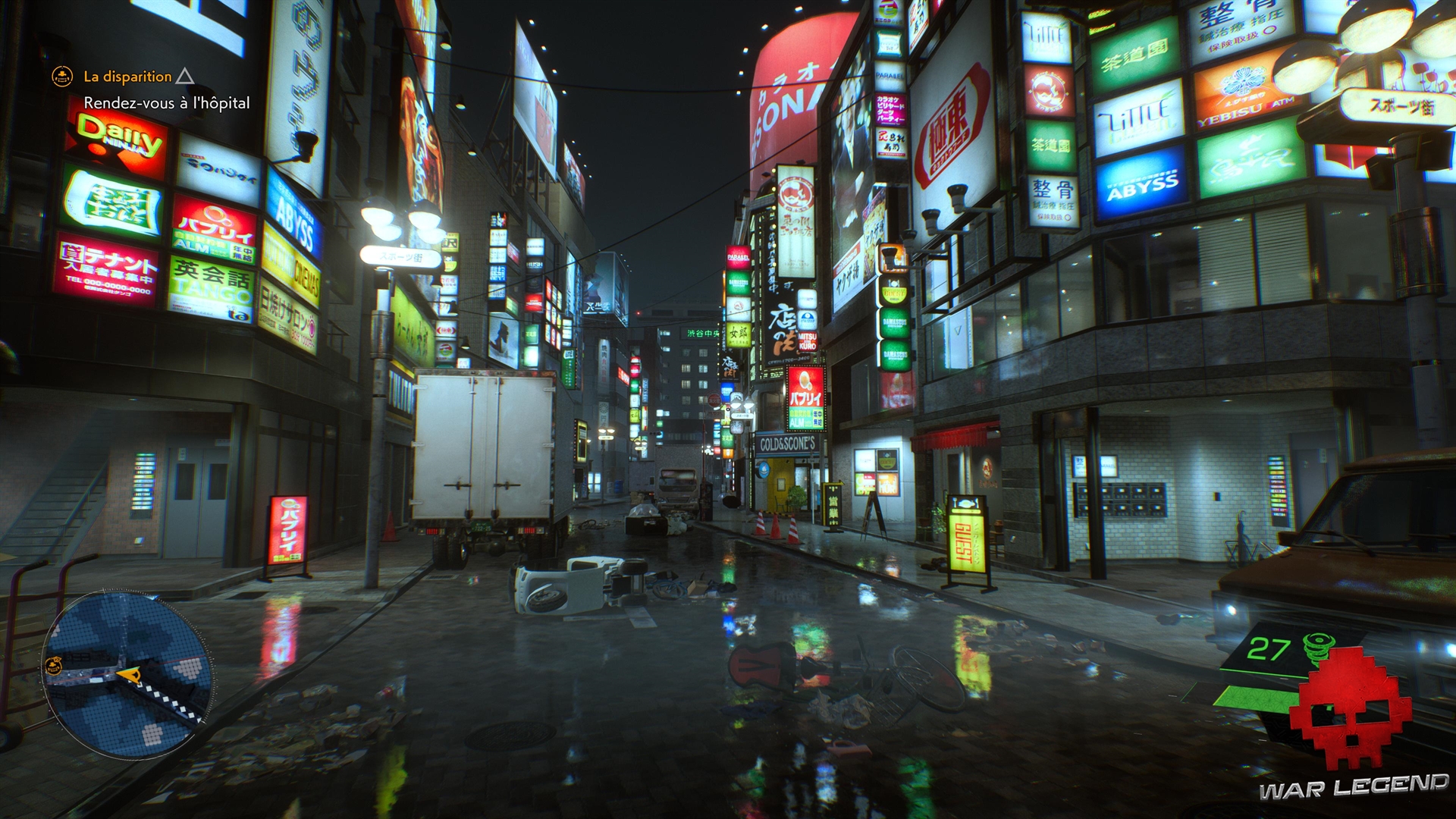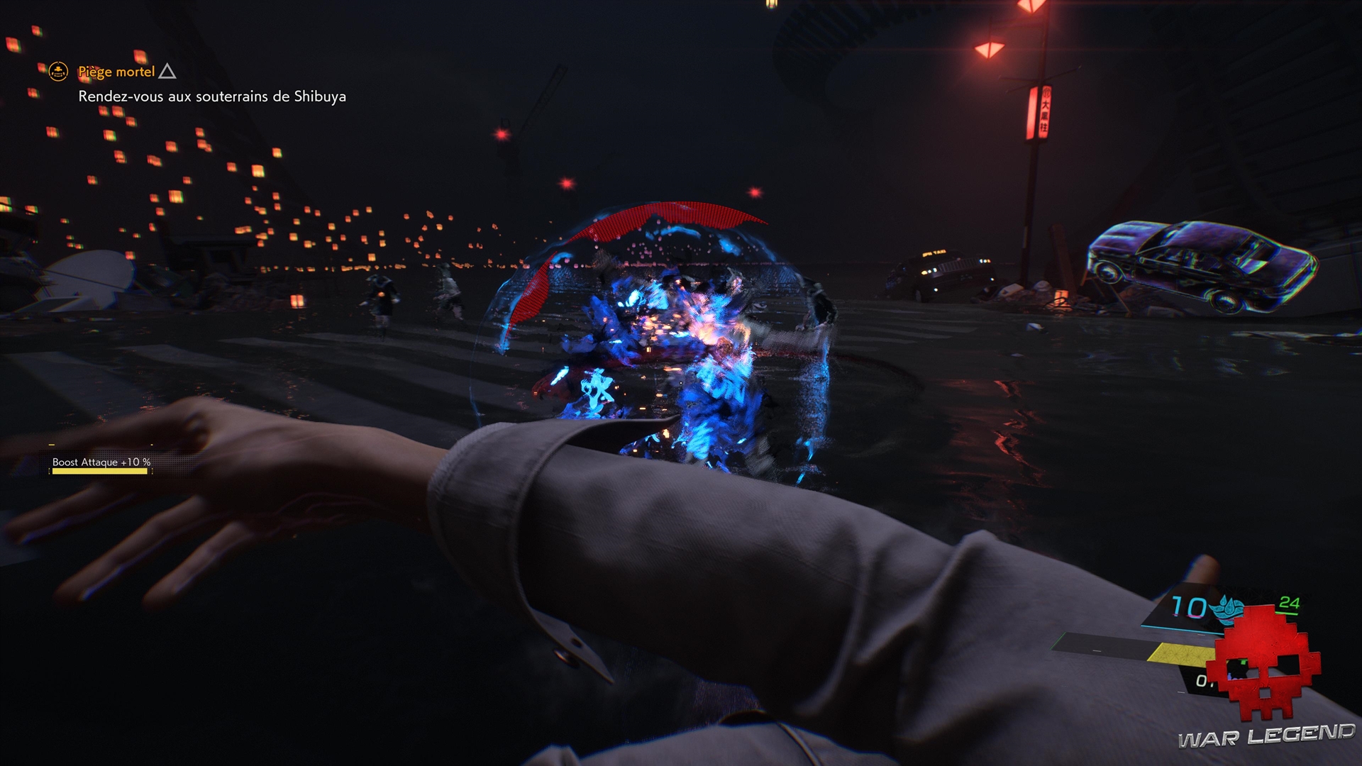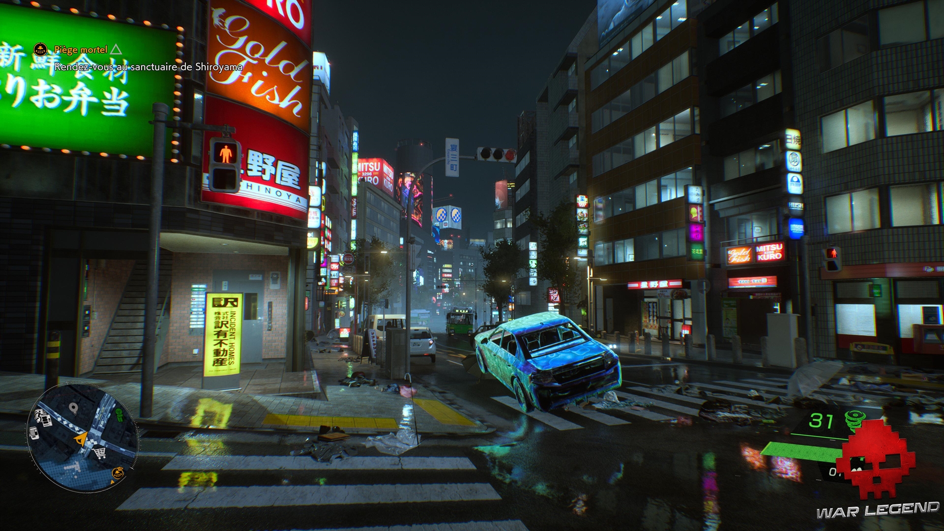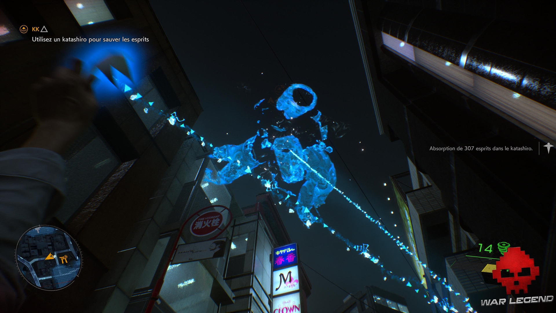 Eh oui, vous allez devoir mettre la main sur les 240 000 habitants du quartier le plus actif de Tokyo par paquets de 100, également nécessaires pour améliorer les capacités d’Akito. Tous les indicateurs sont là pour signaler que le dernier Tango Softworks a toutes les chances de m’épuiser avant même que le titre n’ait eu le temps de décoller, avec sa concentration assez hallucinante de trucs en surbrillance quand on active « la vue spectrale ». Mais bizarrement, il n’en est rien.