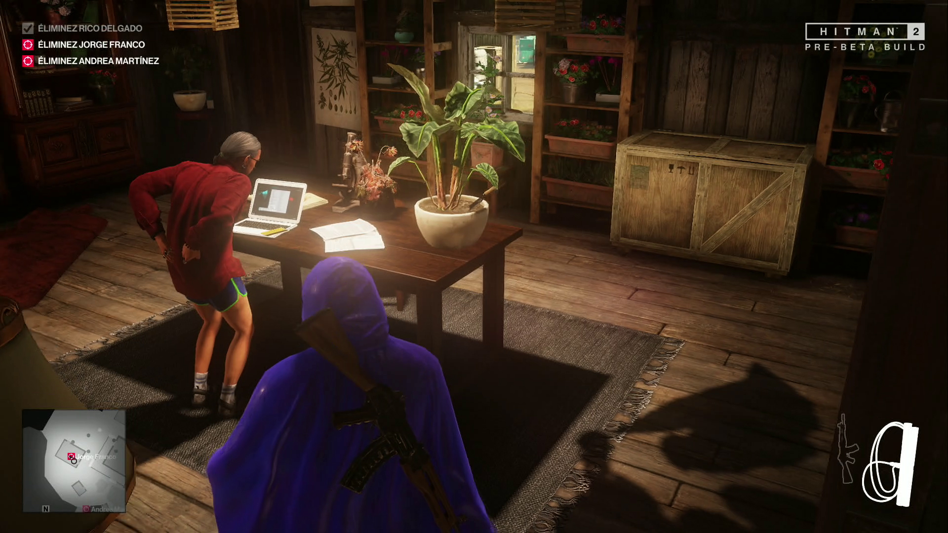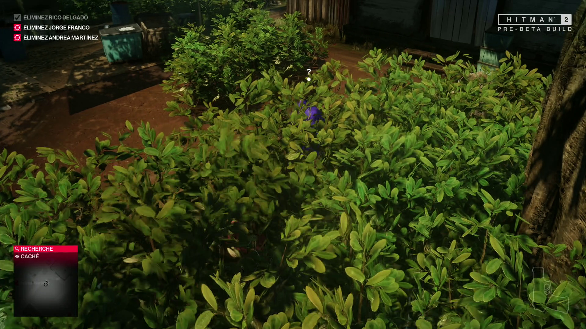 Du coup, toute la zone est en alerte. Passant inaperçu avec mon beau poncho bleu, j’erre entre les bâtiments et les rangées de plantes. Encore une fois, il y a de nombreuses choses à découvrir, comme des indices à collecter qui révèlent de nouveaux embranchements et de nouvelles opportunités pour chaque cible.