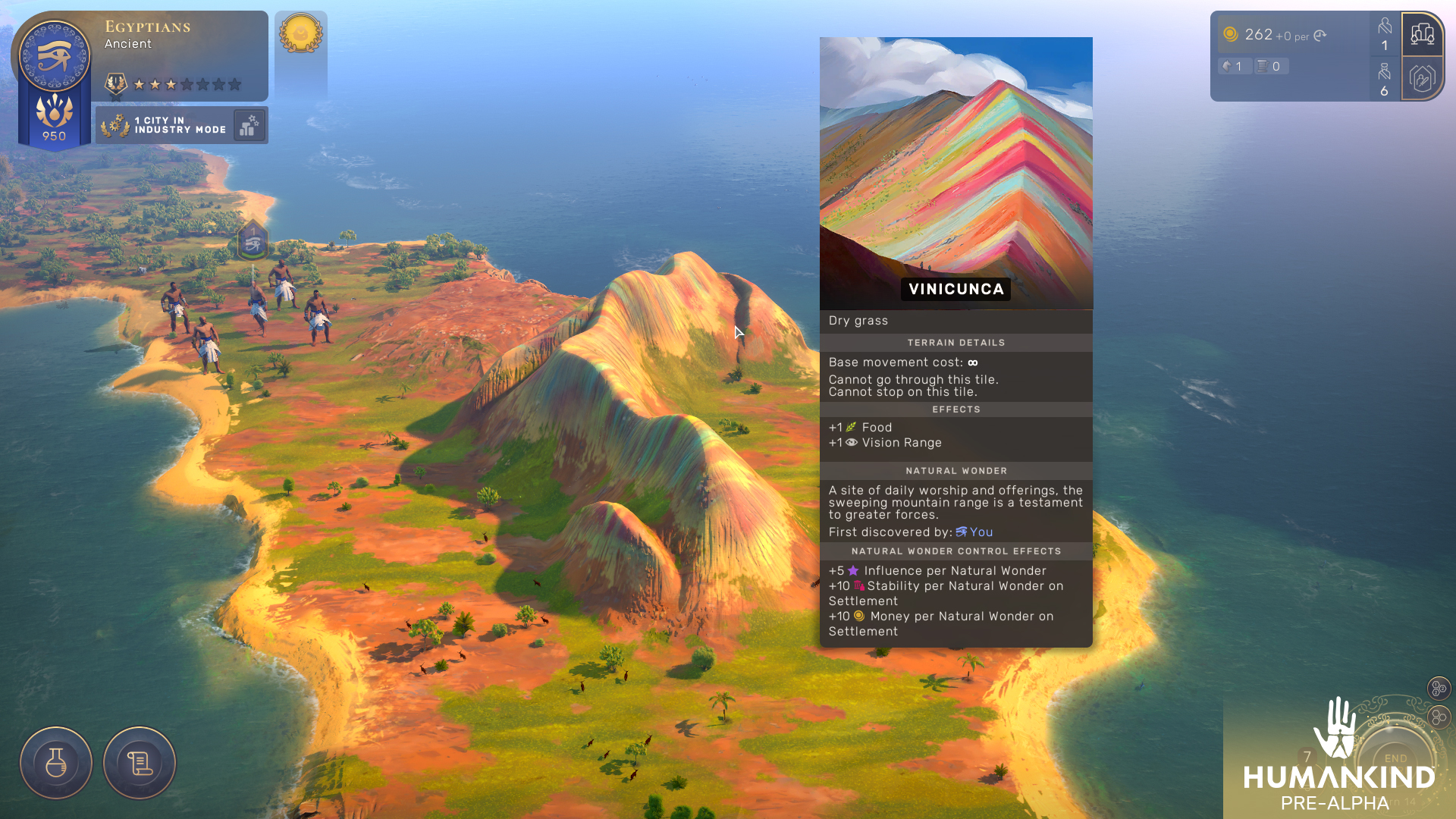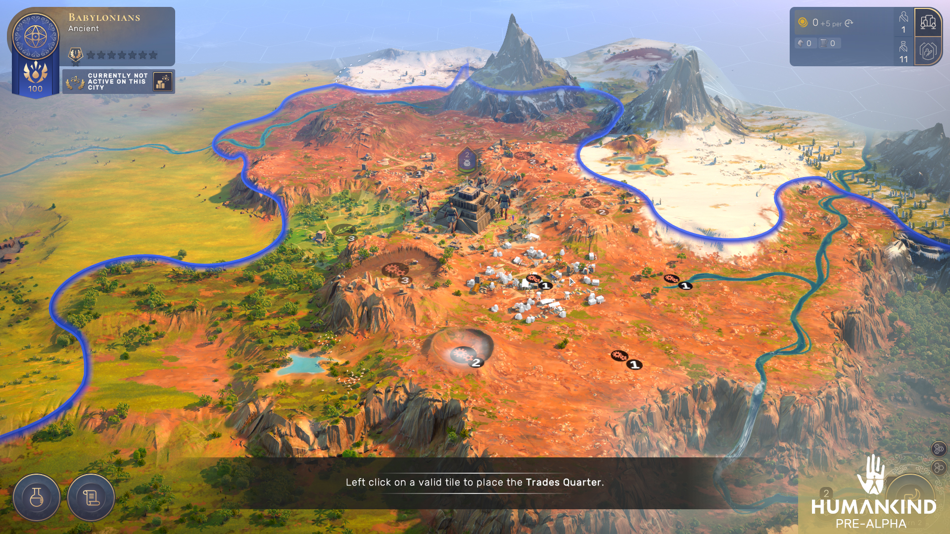 Une fois sa première partie de Humankind lancée, on pourrait confondre avec Civilization 6, c’est vrai. La carte procédurale est découpée en hexagones, les villes produisent des bâtiments, des unités, se spécialisent avec des quartiers, l’arbre de recherche… et plein d’autres mécaniques sont très similaires. On retrouve également le principe des quatre facteurs de productivités de votre civilisation : argent, production, nourriture, science, mais avec un petit nouveau : la stabilité.