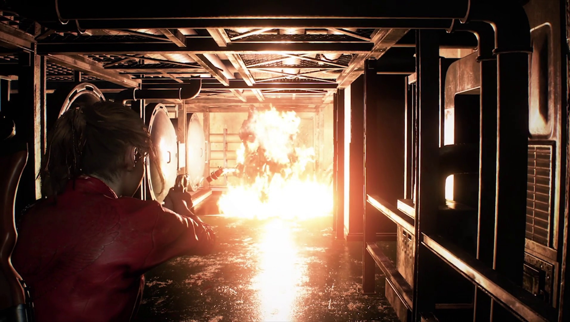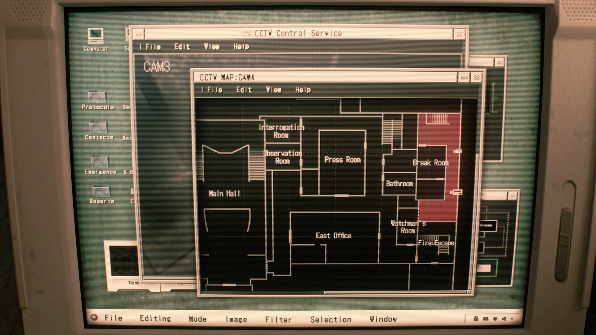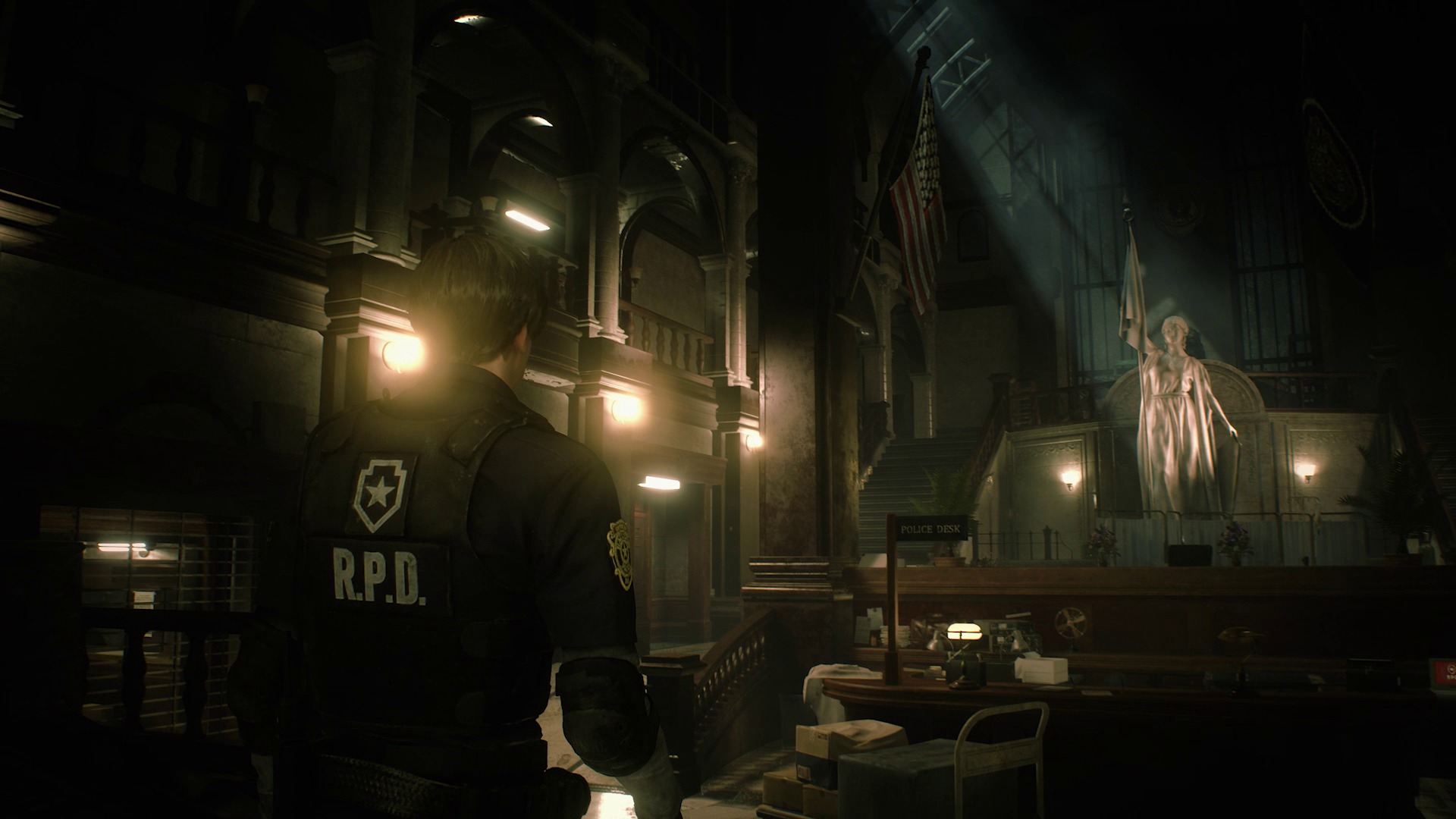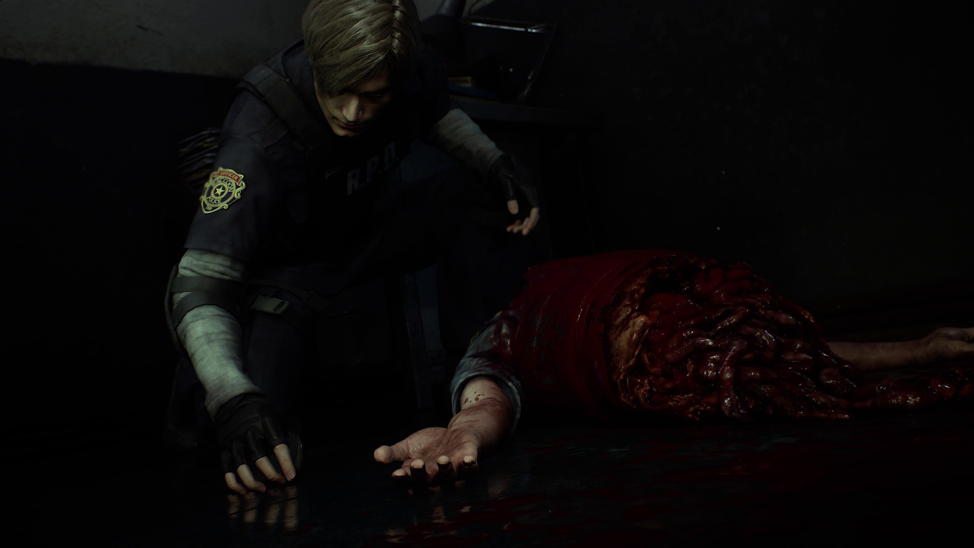 On reconnaît clairement la carte du commissariat, mais le changement de point de vue et l’enrichissement du décor change complètement le regard qu’on aurait pu avoir à l’époque. De plus, des événements en jeu ont été ajoutés ou changés par rapport au matériel de base, comme le pauvre collègue de Leon qui se fait couper en deux sous la port de sécurité. Il s’agissait en fait d’Eliott Edward, le policier qui se fait tuer sur le toit avec l’hélicoptère dans le jeu original.