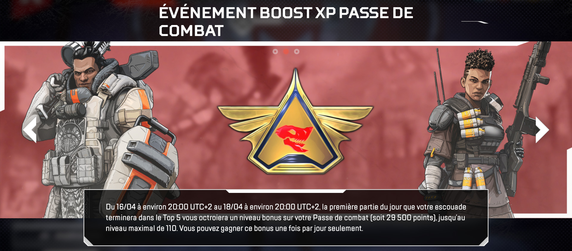 Respawn Entertainment nous offre à occasion de la sortie du patch 1.1.1, un événement concernant l’expérience du Battle Pass qui se déroule du 16 au 18 avril. Durant cette période et une seule fois par jour, finir à la cinquième place ou moins (top 5), vous permettra de recevoir un niveau complet de votre Battle Pass, soit l’équivalent de 29 500 points d’expérience.