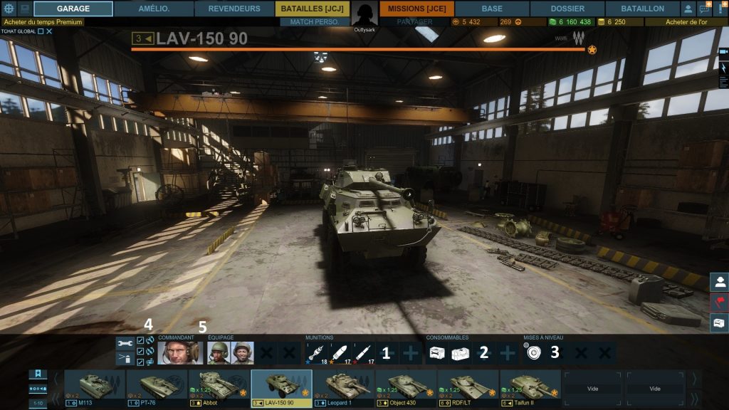 Vous avez également, sur cet écran principal, un accès à la boutique d’amélioration, aux revendeurs de chars, aux amis… et aux missions.
