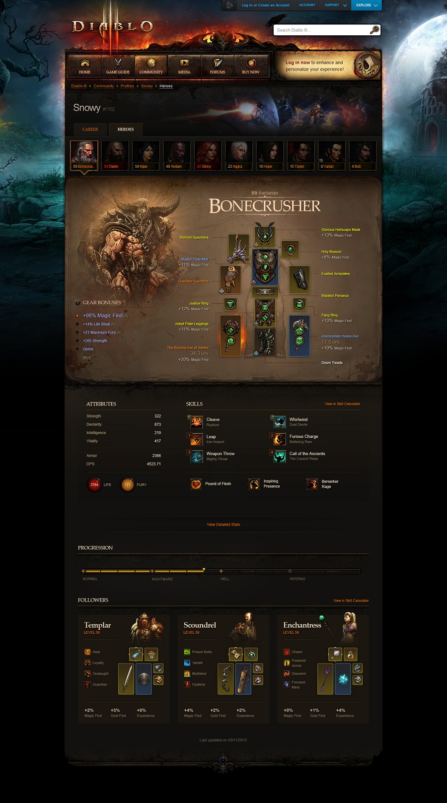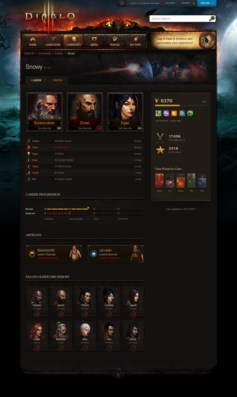 You’ll be able to look at your heroes (or your friends’ heroes) from any page on the Diablo III site through our personalized menu. If you’re curious about the exploits of your fellow forum posters, it’ll be a simple matter to click over to their profiles and feel envious of their gear or how long they’ve managed to keep their Hardcore characters alive.