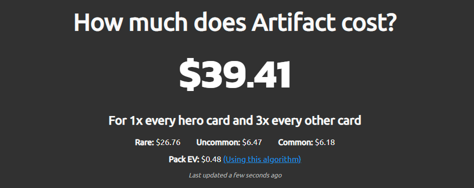 How much does Artifact cost scrute le marché Steam et fait une somme du prix de toutes les cartes de héros et de trois exemplaires de toutes les autres. Actuellement, s’offrir toutes les cartes actuellement disponibles reviendrait à dépenser 39,41$, soit 35,05€. Oui, ce n’est pas beaucoup. Quand on sait qu’une carte comme Axe coûtait presque 18$ à l’époque…