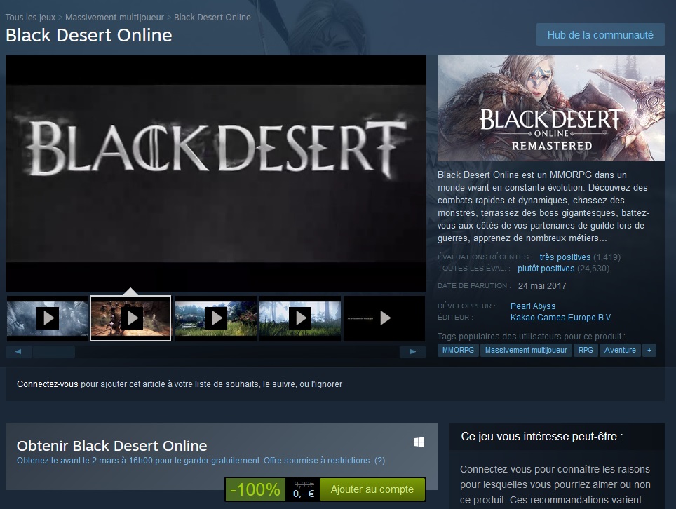 Alors que la PAX East bat son plein, Pearl Abyss a décidé de grossir la population de son MMO Black Desert Online en l’offrant gratuitement sur Steam jusqu’au 2 mars prochain. Les joueurs qui ne possèdent pas le jeu pourront donc le télécharger et le tester durant cette période, et le garder par la suite. Un pack de démarrage leur sera également offert (dans la limite des stocks disponibles).