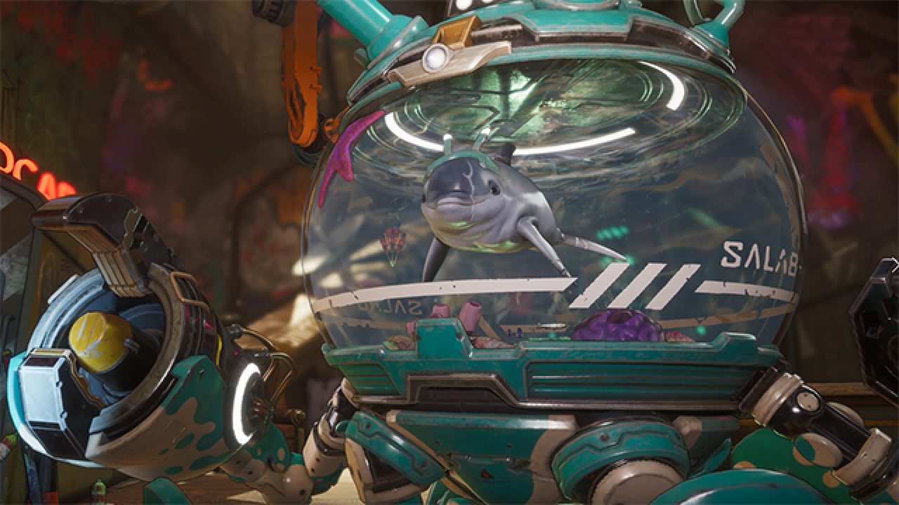 Si Bleeding Edge est reconnaissable entre mille, c’est avant tout grâce à son chara-design des plus… exotiques. Le nouveau personnage ne fait pas exception, puisqu’il s’agit d’un dauphin dans un bocal, accroché à un mécha. Un personnage classique dans Bleeding Edge.