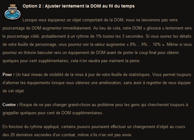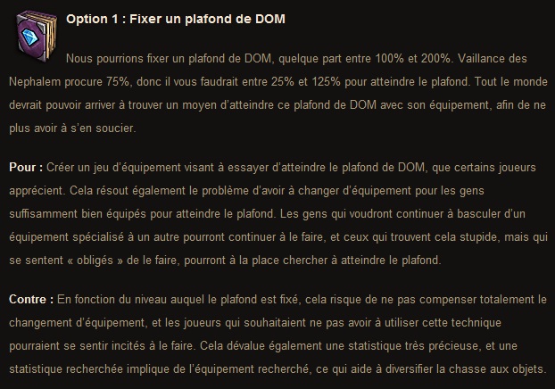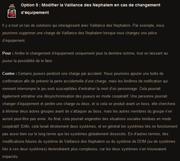 Résumons : – Option 1 : Introduire un plafond de valeur du magic find, on en reviendrait à un stuffing similaire au magic find de Diablo 2 – Option 2 : Le bonus magic find deviendrait un bonus progressif, ce qui nous forcerait à garder notre stuff mf en permanence pour atteindre la valeur maximale. – Option 3 : Un laps de temps de trente secondes après un changement d’équipement avec comme but de re-équiper votre stuff normal/dps et ainsi conserver votre bonus mf. – Option 4 : Le titre parle de lui-même, l’idée semble un peu trop radicale. – Option 5 : Supprimer un stack de buff Nephalem lorsque vous changez d’équipement, pas dramatique mais c’est un nerf et les nerfs, y’en a déjà trop eu.