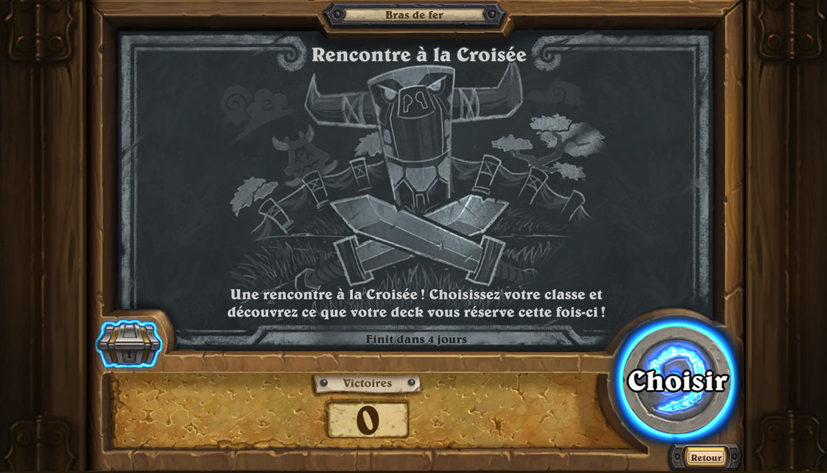 Pour cette semaine, Blizzard n’a pas topdecké la carte de l’originalité. C’est encore une fois le bras de fer Rencontre à la Croisée qui nous ai proposés. Ici, l’aléatoire en force. Vous prenez une classe et avez un deck pré construit aléatoirement. Vous avez de la chance ou non. Voilà bon amusement !