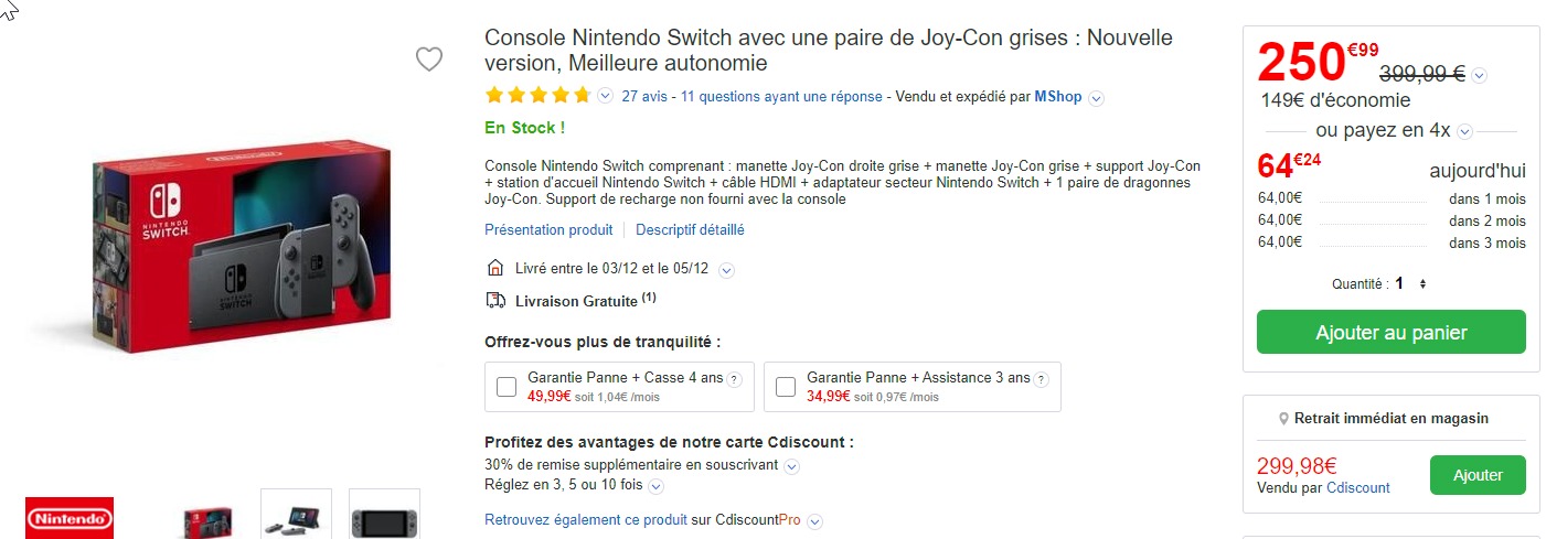 Parce que la Nintendo Switch se vend encore comme des petits pains depuis sa sortie au mois de mars 2017, son prix officiel n’a pas encore baissé, mais on peut faire confiance aux distributeurs français pour régler le souci. Pour le Black Friday 2019, CDiscount propose une Switch à 250€.