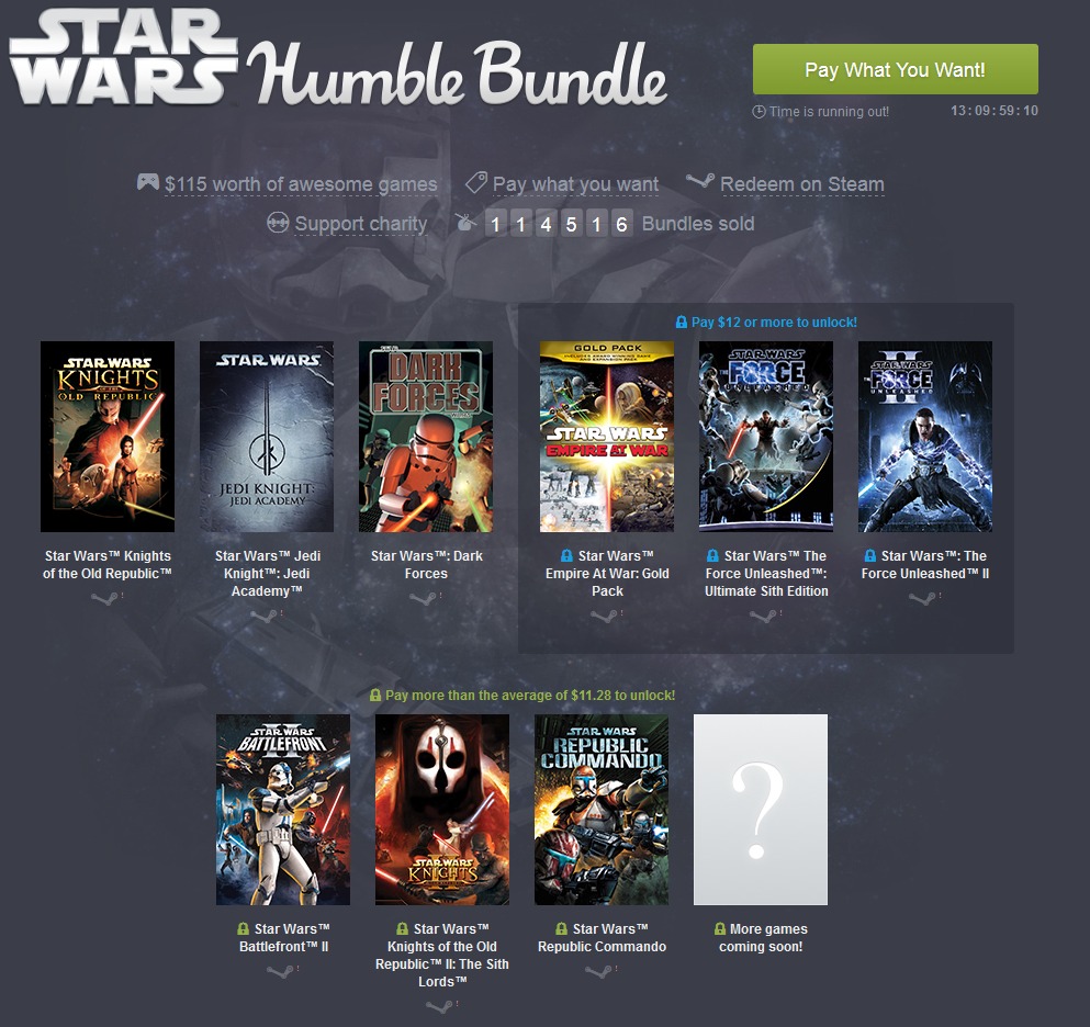 A partir d’aujourd’hui et pendant 2 semaines, Humble Bundle nous propose un pack Star Wars pour soutenir 2 associations caritatives : Star Wars Force for Change et UNICEF US. Dans ce pack vous pourrez retrouver tous les jeux mythiques de la saga !