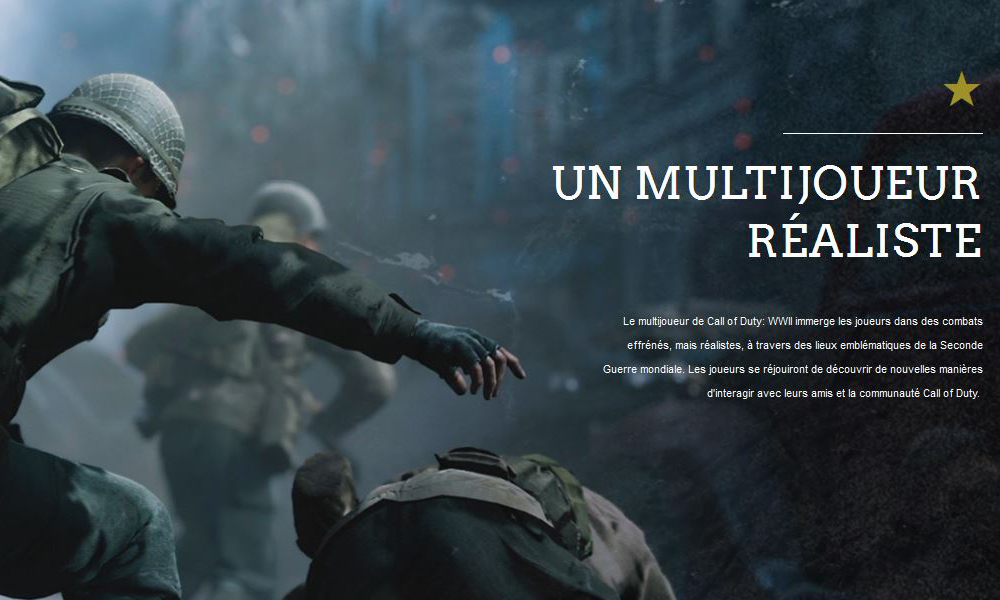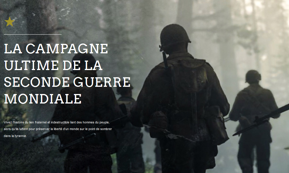 Vous l’aurez compris : cette année, Activision ne nous servira ni guerre futuriste, ni voyage au Vietnam (bye bye Fog of War, du moins pour cette année). Nous retournons donc, rangers aux pieds et M1 Garand en main, sur les champs de batailles de la Seconde Guerre mondiale. Avant de vous en dire plus, on vous laisse savourer la première bande-annonce (intégralement en français) du jeu, qui commence bercée par un célèbre discours de Winston Churchill, sur les plages de la Normandie…