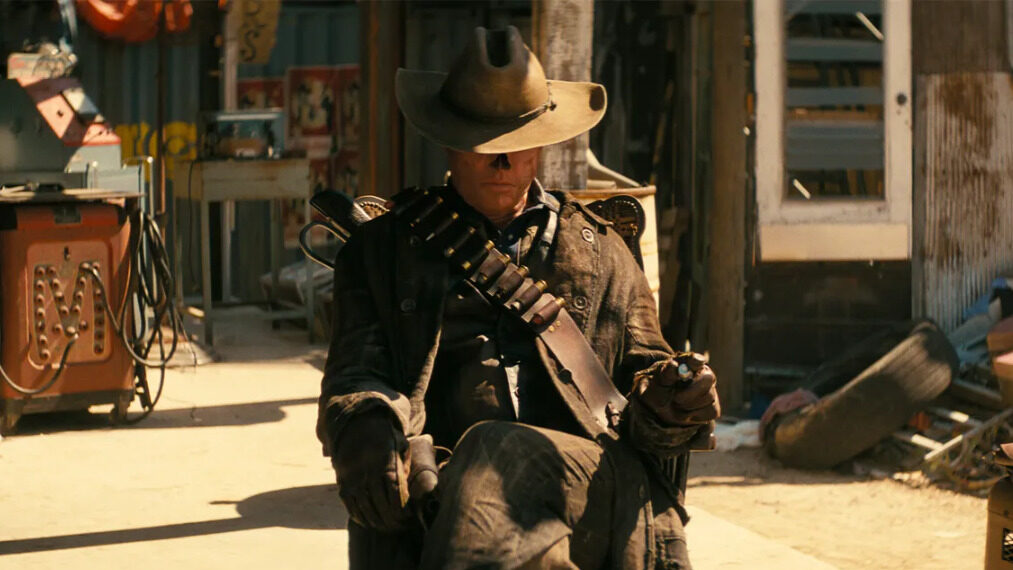 M’enfin, « post-apocapyltique », il ne faut pas le dire trop vite pour l’instant, parce que les images proposées ne dépeignent pas encore un monde qui tente de se reconstruire à la suite d’une guerre thermonucléaire globale, en dehors d’une goule incarnée par Walton Goggins, dont le chapeau de cow-boy cacherait presque son nez inexistant.
