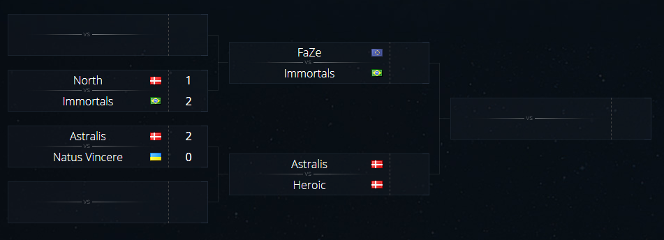 En attendant, je vois bien un Astralis-FaZe en finale, surement 2-1 dans chaque demi finale, je pense qu'Heroic et Immortals ont pris un gain de confiance au vu de leurs performances, ça prédit que du beau jeu :)