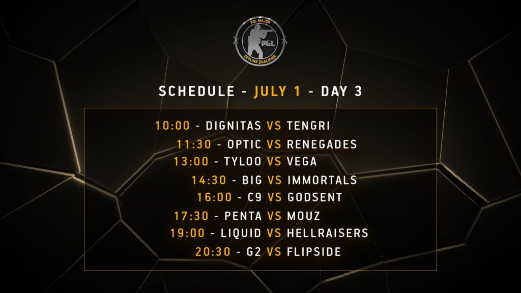 - Équipes à une victoire et une défaite : Vega Squadron, Team Liquid, TyLoo, BIG, Hellraisers, Immortals, Cloud9, GODSENT