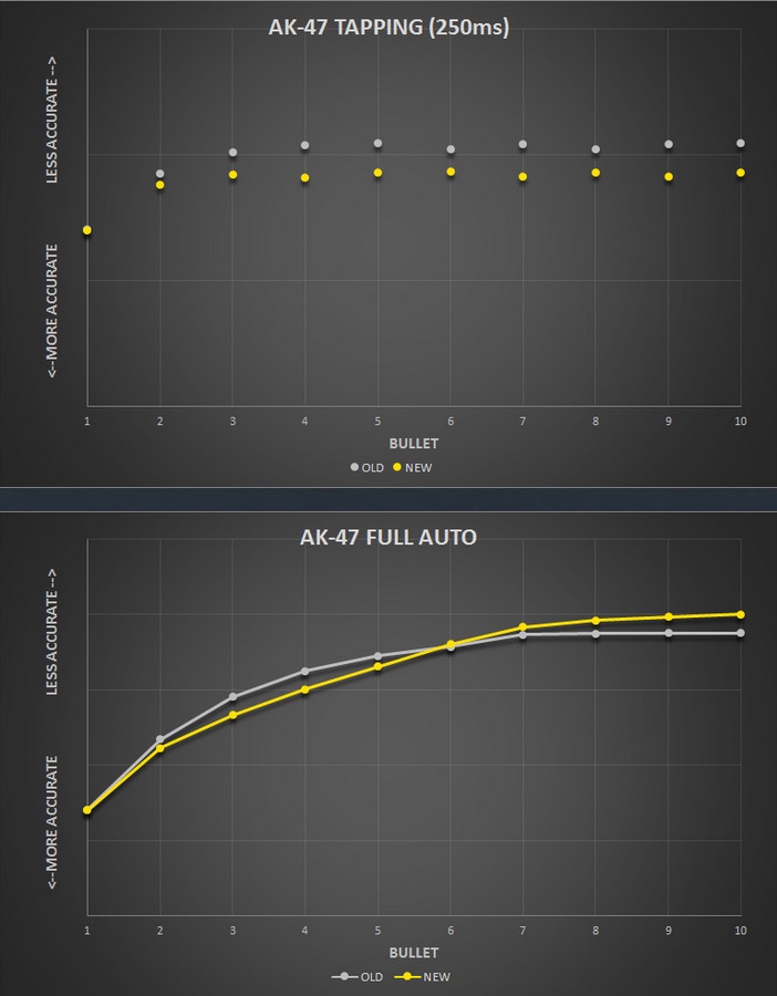 Ici, les graphiques concernant la précision de l’AK-47 selon son type d’utilisation ©ValveComme vous pouvez le voir sur ce graphique la précision du tapping est améliorée tandis que le spraying (ici appelé full auto) perdra de sa précision dés la 7ème balle tirée. Les autres évolutions du jeu concernent les sons des pistolets. En effet après avoir changé le son du P90 courant juillet, c’est au tour des armes de poing d’être modifiés, afin d’apporter des images aux modifications apportées au jeu, nous vous avons déniché une vidéo (oui, oui, en Anglais, désolé) de deux minutes faisant un tour rapide des changements, voyez par vous même :