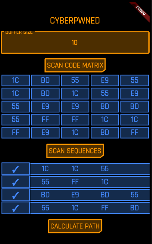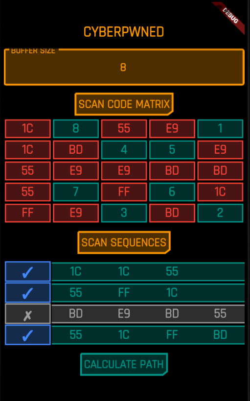 Après que vous ayez démarré l’application, vous devriez voir un exemple de matrice et séquences avec lesquels vous pouvez jouer. Si vous entrez une taille de buffer, le bouton « Calculate path » est disponible. Pour scanner une matrice/séquence différente, appuyez simplement sur le bouton « Scan ».