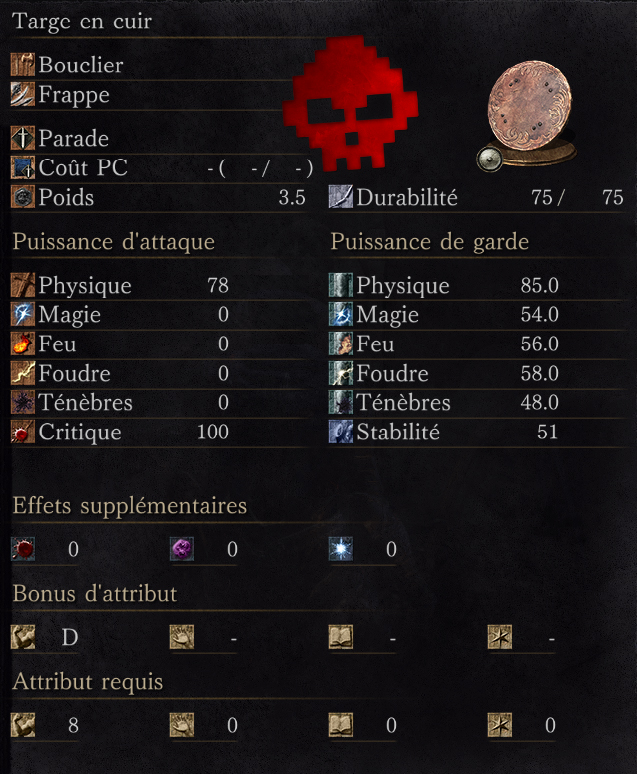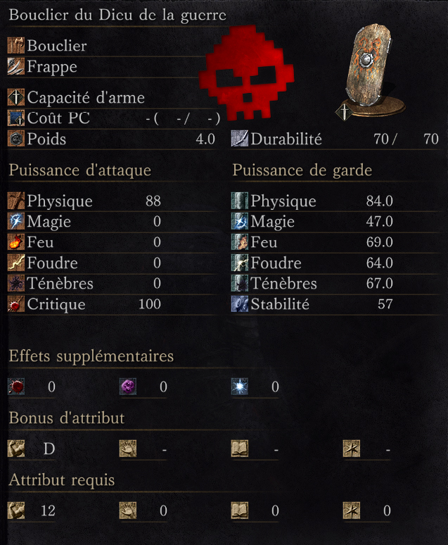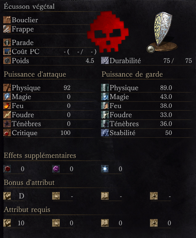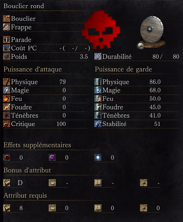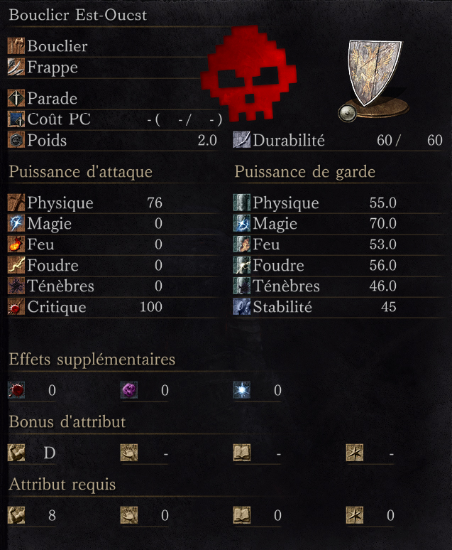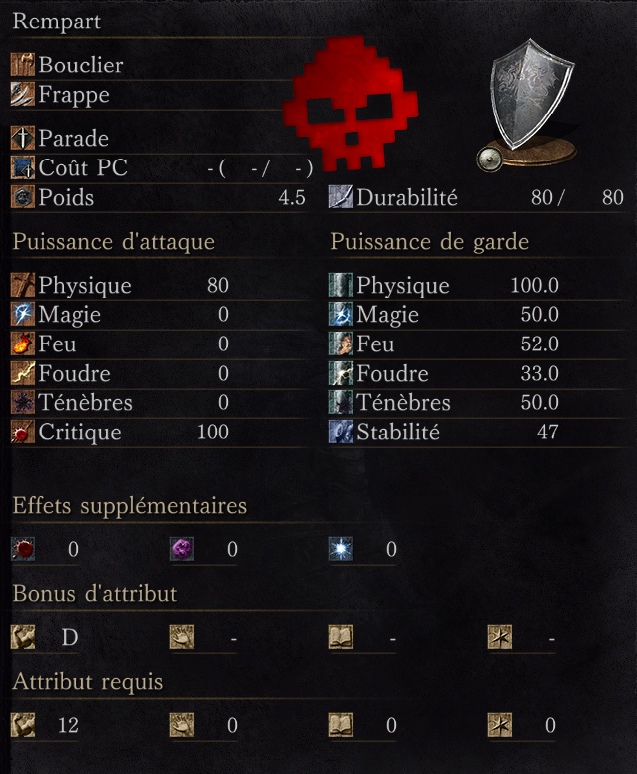 S’équiper de ce Bouclier en main gauche permet de recourir à la capacité associée à l’arme tenue en main droite.