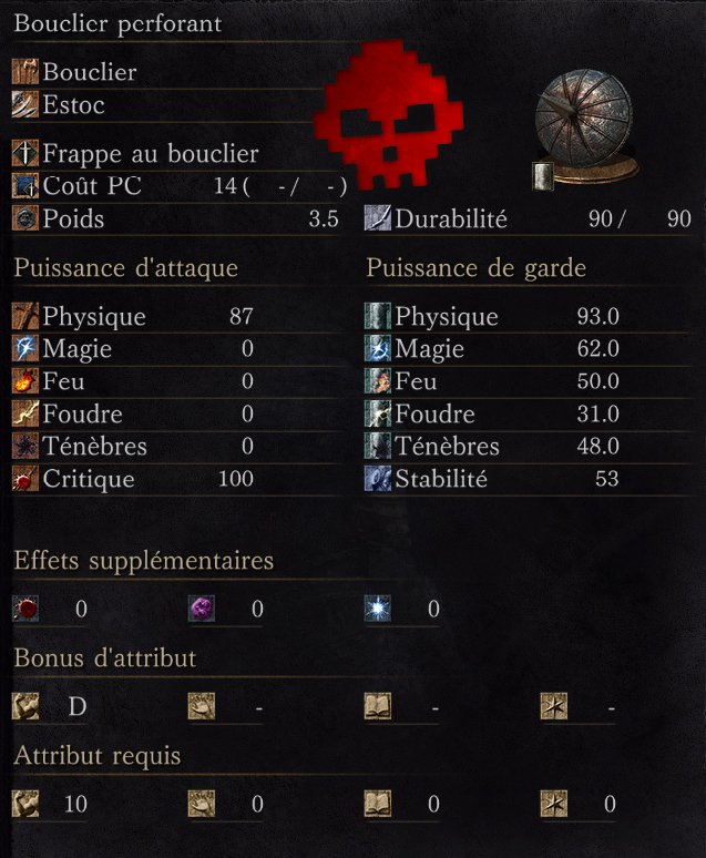 Employée eu bon moment, cette capacité permet de parer une attaque avant d’infliger un coup critique à l’adversaire. Fonctionne quelle que soit la main qui tient le Bouclier, et permet également de dévier les sorts.