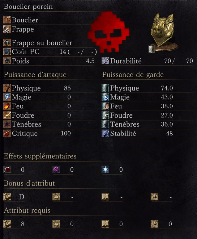 « Bouclier représentant une tête de cochon plus vraie que nature. Il a été conçu pour faire honte aux chevaliers manquant de ferveur, et ceux qui se retrouvaient condamnés à le porter étaient tournés en ridicule par leurs frères d’armes. Passé un certain seuil d’avilissement, on ne peut plus compter sur le soutien de personne. »