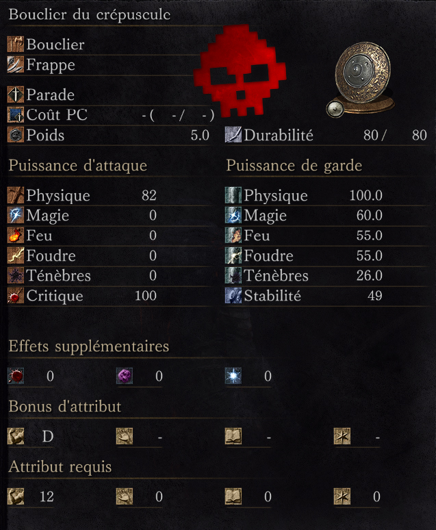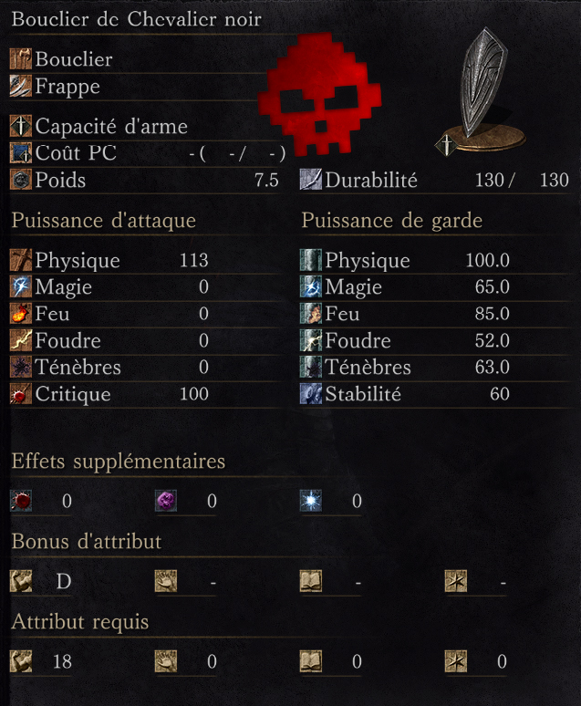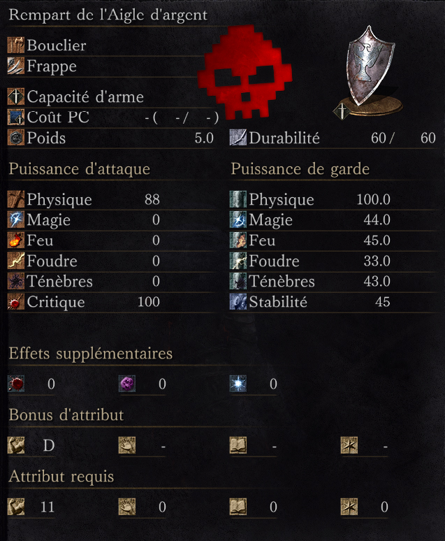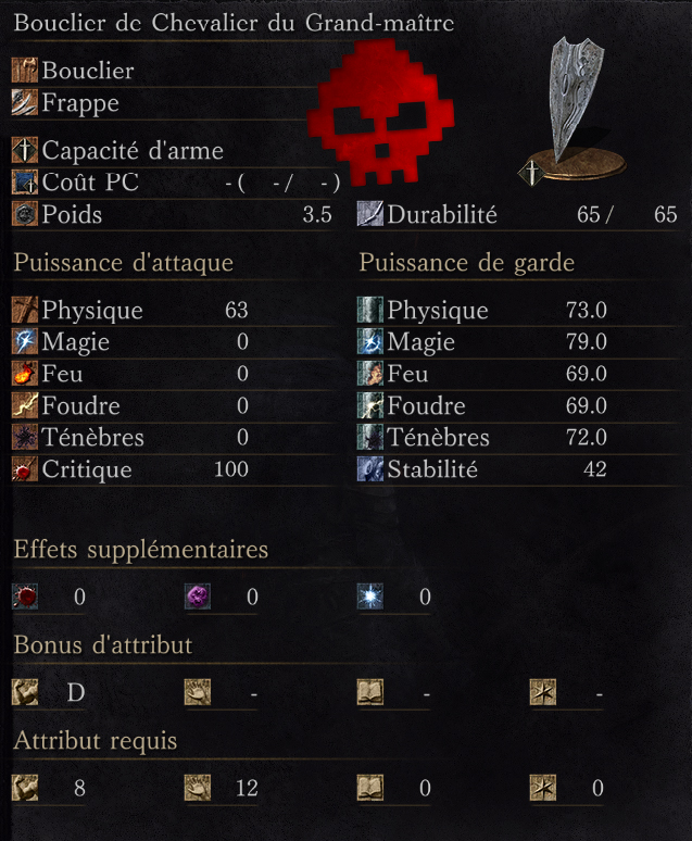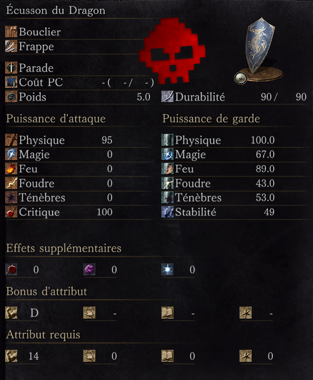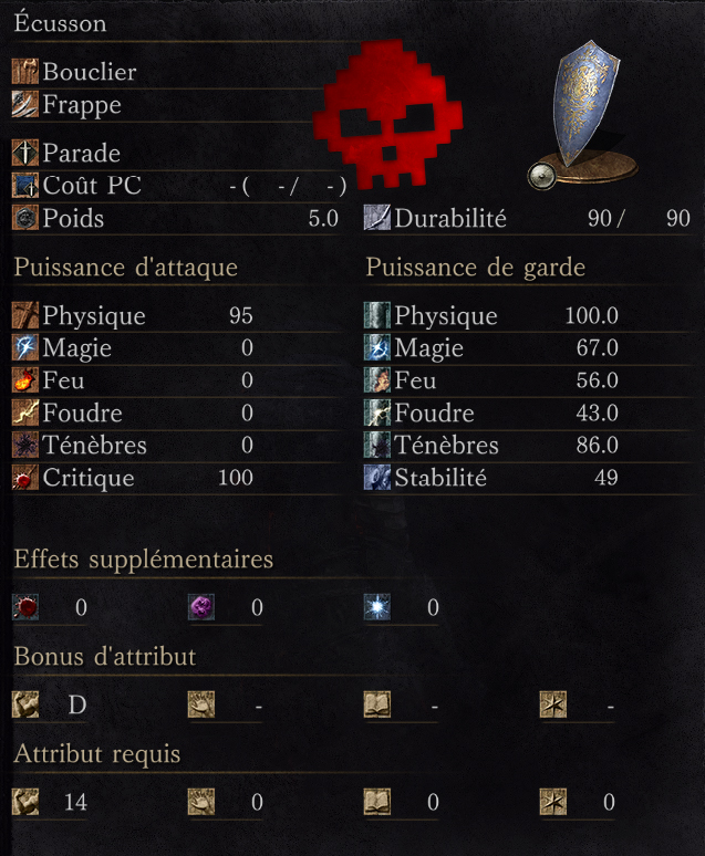 « Bouclier de chevalier orné d’un emblème. C’est l’un des Boucliers bleus enchantés. L’Écusson réduit considérablement les dégâts de Ténèbres infligés à son porteur. »