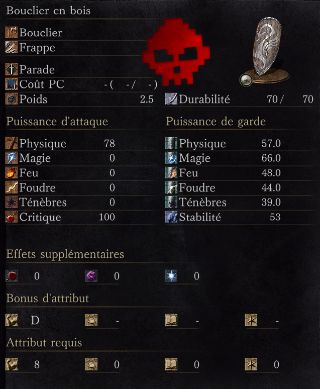 « Bouclier en bois orné d’un symbole ancien représentant un aigle bicéphale. Il est à peine plus grand qu’une Petit Bouclier. Les Boucliers en bois sont légers, maniables et disposent d’une capacité d’absorption de la magie relativement développée. »