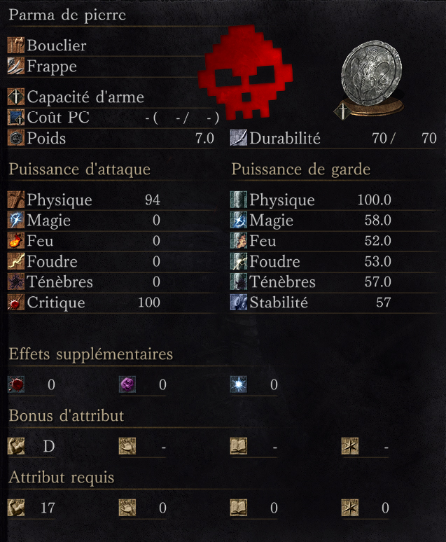 « Un Bouclier rond en pierre. Il appartenait autrefois à un chevalier qui a fini pétrifié. Il est très efficace en son genre, mais se révèle extrêmement pesant. »