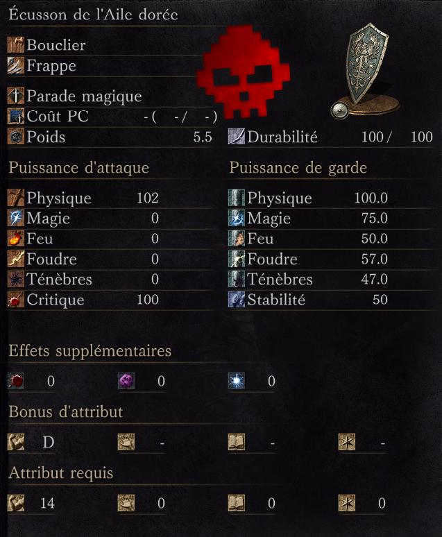 « Bouclier de chevalier orné d’un emblème représentant une aile dorée. C’est le meilleur d’entre les Boucliers bleus enchantés. Il dispose d’une très bonne capacité d’absorption de la magie, mais permet également à son porteur de dévier les sorts. »