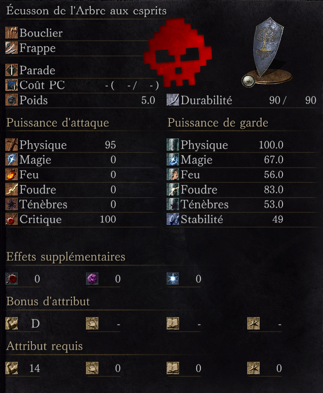 « Bouclier de chevalier orné d’un emblème représentant un Arbre aux Esprits. C’est l’un des Boucliers bleus enchantés. L’Écusson de l’Arbre aux Esprits réduit considérablement les dégâts de foudre infligés à son porteur. »
