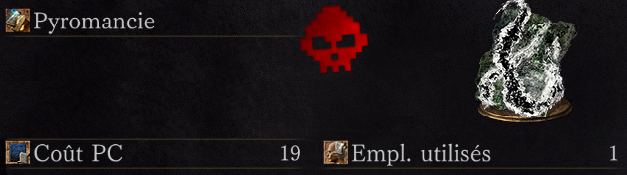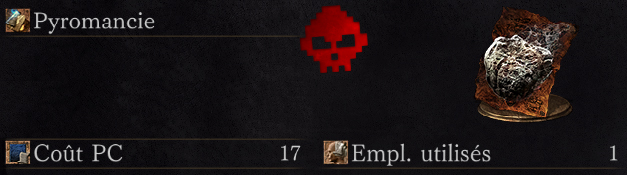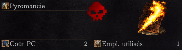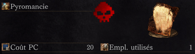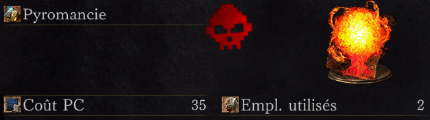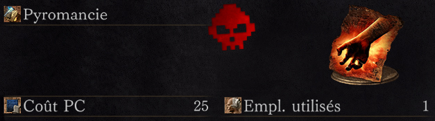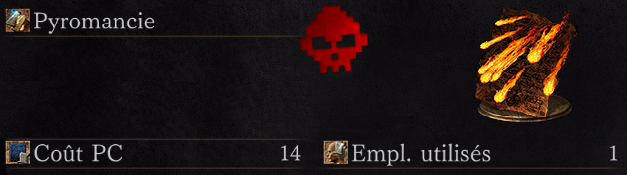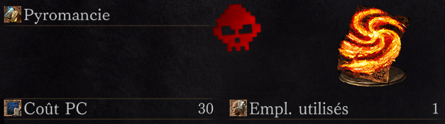 « Une forme de pyromancie relativement simple. C’est souvent la première que l’on apprend. Elle permet de lancer une Boule de Feu. Pour employer une forme de pyromancie, il vous suffit de l’assigner à un emplacement de sort en faisant halte près d’un Feu, sans oublier de vous équiper d’une Flamme de Pyromancie. »