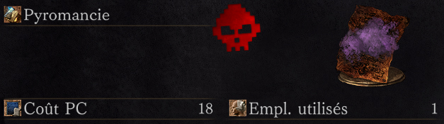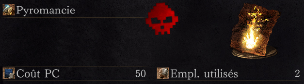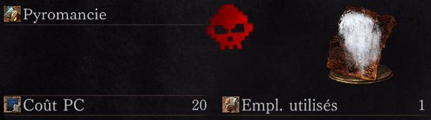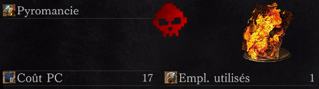 « Une des formes de pyromancie interdites concentrant la puissance du feu qui l’habite dans l’organisme du lanceur. Elle augmente temporairement l’attaque, mais s’accompagne d’une perte progressive des PV. Un pyromancien craint le feu, mais finit par comprendre que la peur est l’un des moteurs de son art et fait de sa faiblesse une force. »