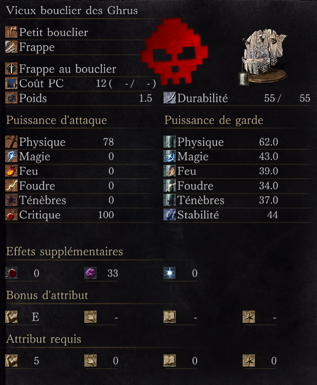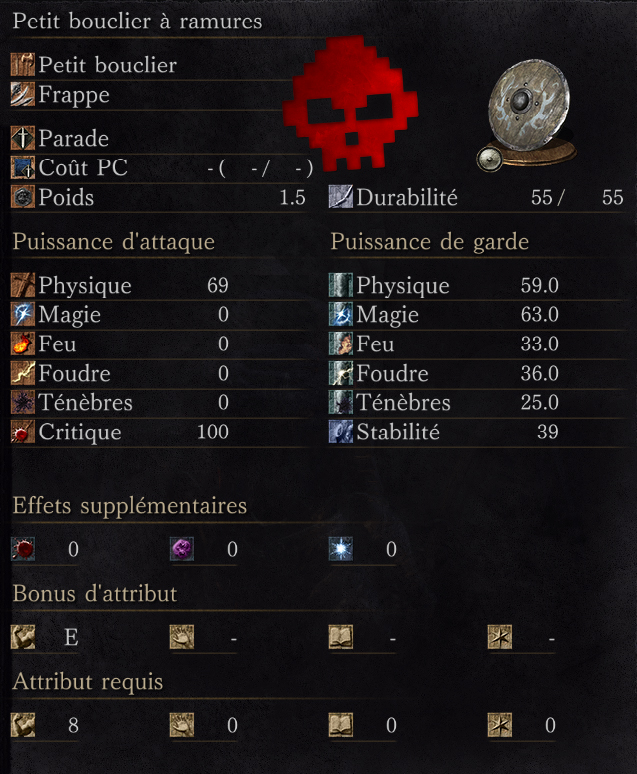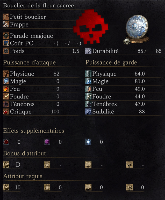 Employée au bon moment, cette capacité permet de parer une attaque avant d’infliger un coup critique à l’adversaire. Fonctionne quelle que soit la main qui tient le Bouclier, et permet également de dévier les sorts.
