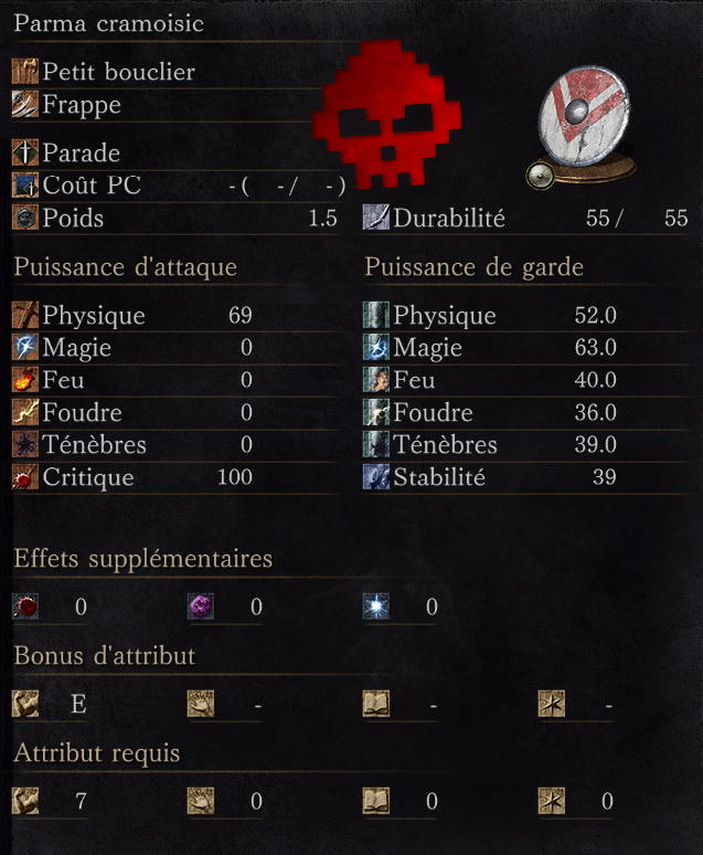 « Bouclier en bois rond standard. Sa teinte rouge symbolise le sang des guerriers. Les Boucliers en bois sont légers, maniables, et disposent d’une capacité d’absorption de la magie relativement développée. »