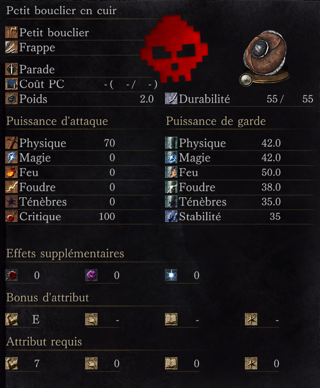 « Petit Bouclier rond recouvert de cuir. Sa grande protubérance centrale permet de parer les attaques. »