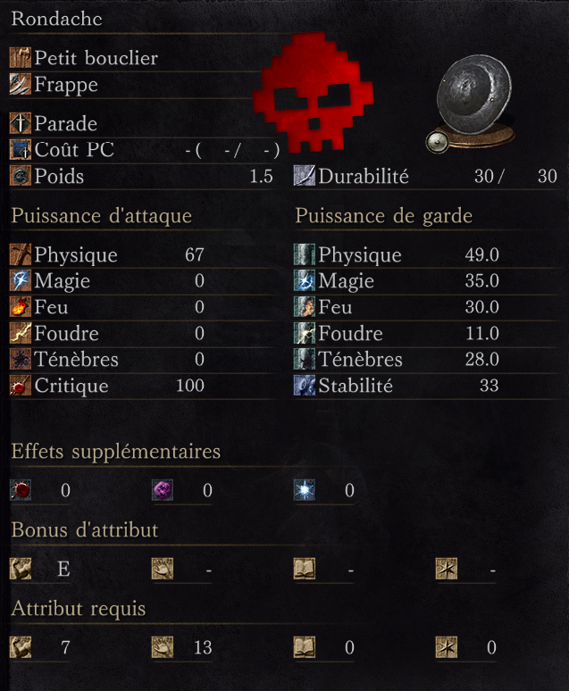 « Bouclier en métal rond très petit. Sa grande protubérance centrale permet de parer les attaques. »