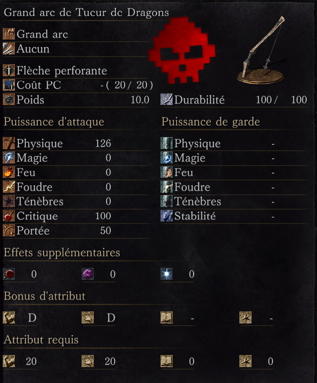 « Arc Long des Monte-Dragon, serviteurs du vieux Roi de la Convoitise. Les Monte-Dragon étaient la garde royale du vieux Roi. Ce dernier exigeait d’eux une grande force physique, comme en témoigne cet Arc dont le maniement est réservé aux surhommes. Il permet toutefois à ceux qui parviennent à le manier d’effectuer des tirs dévastateurs. »