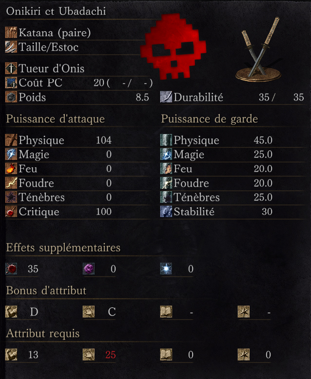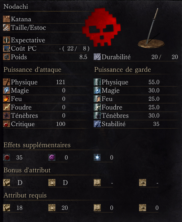 « Un Katana unique en son genre, caractérisé par le travail soigné des artisans de la province orientale dans laquelle il a été forgé. Tranchante comme un rasoir, sa lame inflige des saignements, mais tend à se briser facilement. »