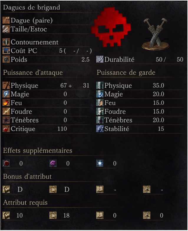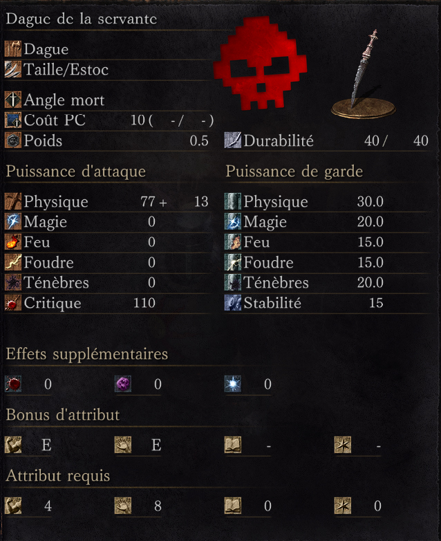 « Cette dague était utilisée par les servantes de la Capitale Profanée, des femmes qui, à ce que l’on raconte, prenaient plaisir à faire souffrir les autres. Chaque attaque réussie restaure quelques PC. »