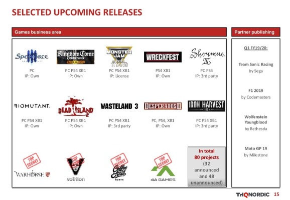 Lors de la publication de ses derniers résultats financiers, le géant autrichien avait annoncé 80 jeux en développement, dont 32 annoncés et 48 non annoncés. Parmi les jeux annoncés, on avait pu apercevoir Shenmue III, Wastelands 3 ou encore un certain Dead Island 2.