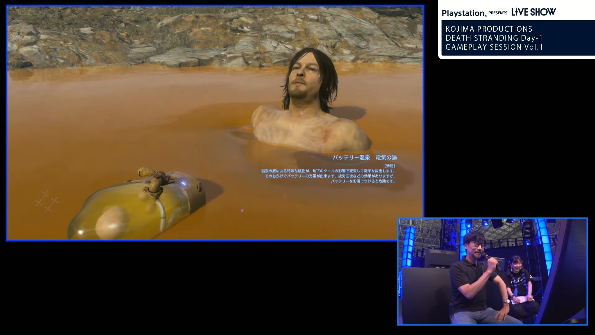 Le bébé que porte Sam a également été mis en avant : comme prévu il sera question de maintenir son niveau de stress assez bas. Pour cela on peut le bercer, jouer de l’harmonica, jouer avec lui dans une source chaude (oui)… Cette source chaude témoigne d’ailleurs de la touche « jeu de survie » de Death Stranding : elle est située en montagne et Sam s’en sert pour réguler sa température corporelle – l’instant d’avant, il montre clairement qu’il se les gèle.