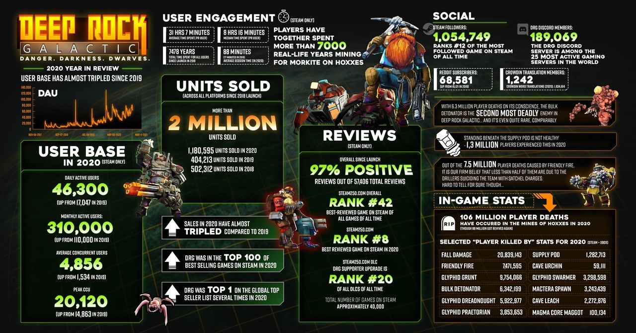 Trêve de plaisanterie : dans une infographie bien foutue et assez complète, Ghost Ship Games indique que 2020 représente à lui seul plus de la moitié des ventes de Deep Rock Galactic. Avec des évaluations « extrêmement positives » sur Steam, le titre possède un taux d’engagement particulièrement élevé, avec un temps de jeu moyen par joueur de 30 heures. Il ne faut pas oublier que le titre est également disponible sur consoles Xbox via le Game Pass.