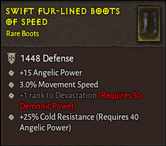 De plus, elles pourront apparaître en tant qu’affixes sur les différents objets (+15 Angelic Power, par exemple). Les autres affixes pourront également être verrouillés derrière ces nouvelles statistiques, comme une sorte de prérequis. Vous ne pourrez bénéficier de leurs effets que si vous possédez assez de points dans la statistique demandée. Par exemple, un objet pourra vous donner 25% de résistance au feu seulement si vous avez au moins 55 en Demonic Power.