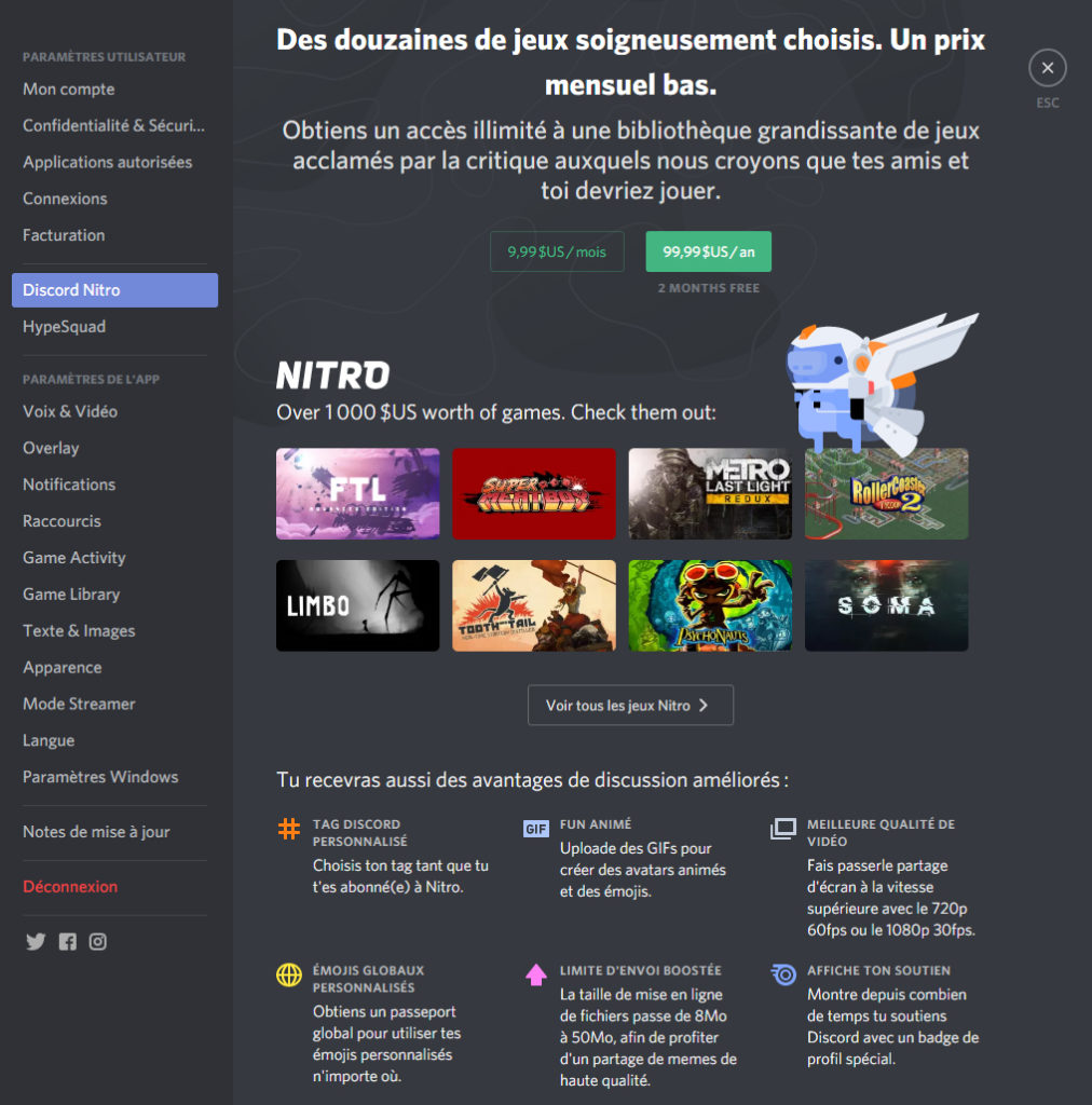 Celui-ci se greffe à l’abonnement NITRO, déjà présent, qui permettait d’avoir des avantages dans la communication avec ses amis via des emotes personnalisés, des avatars animés ou encore des permissions plus souples dans l’envoi de fichiers.