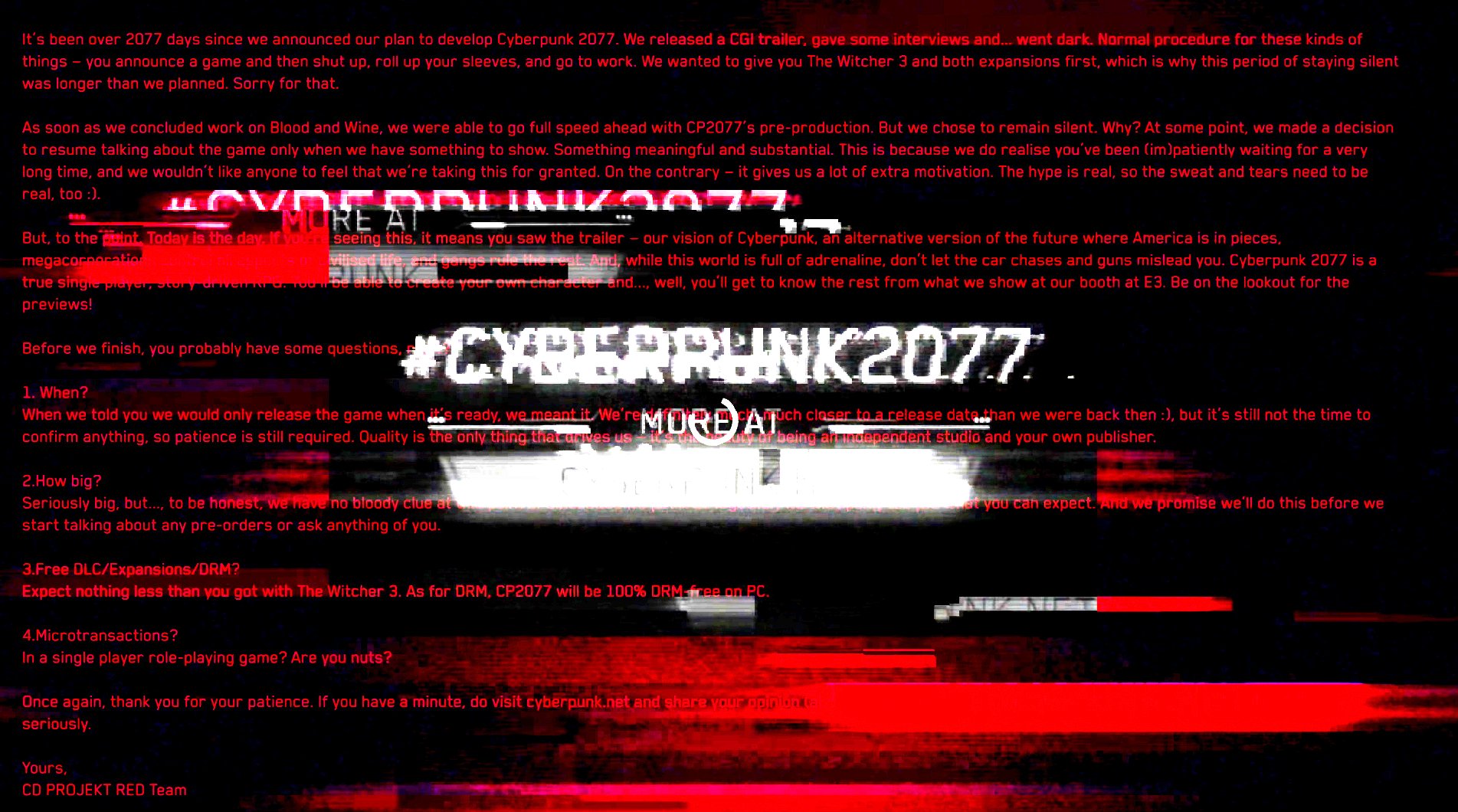 Le message se termine en nous invitant à surveiller le site officiel du jeu (cyberpunk.net) pour ne pas manquer les prochaines infos, qui ne devraient pas tarder.