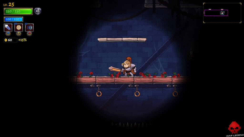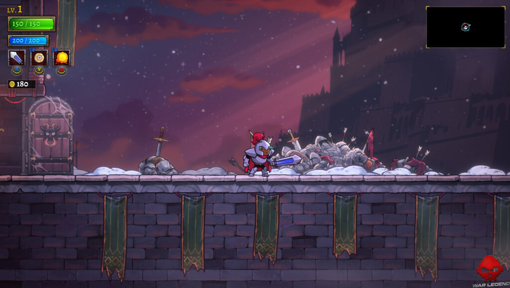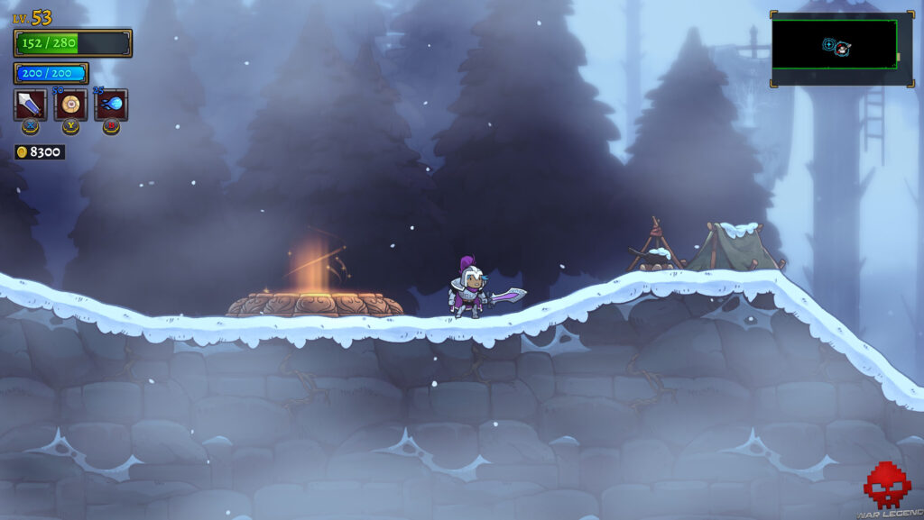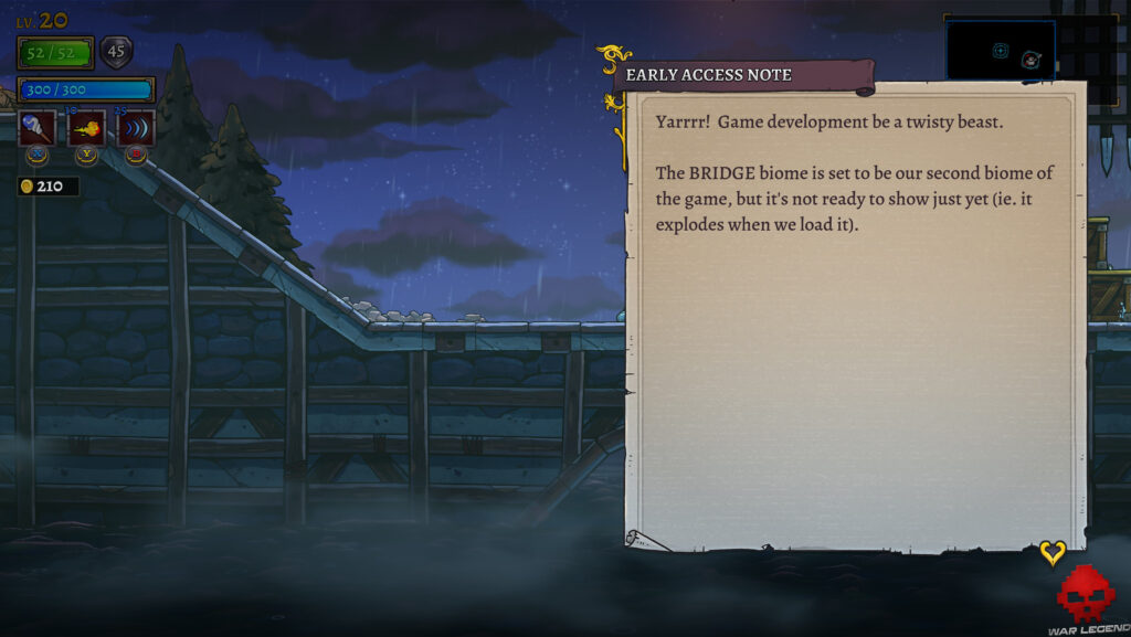 Pour l’heure, seuls ces 2 biomes sont disponibles pour Rogue Legacy 2, les développeurs affirmant (une fois de plus non sans humour) que dès qu’ils intègrent le second biome (pont), il explose. On passe donc immédiatement au 3e biome, celui de la neige.
