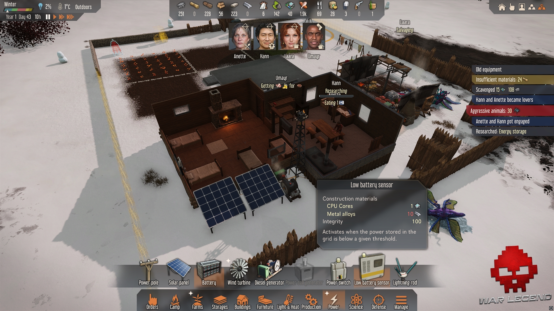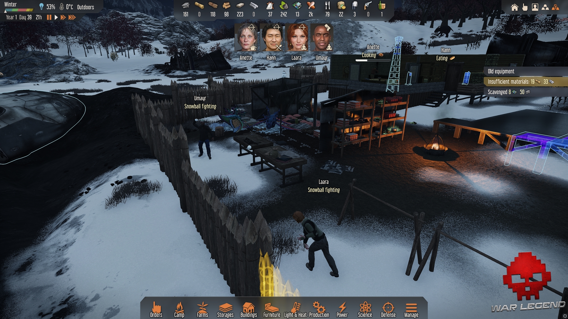 Avec le confort lié au développement de la base qui s’améliore, les baisses d’humeur sont de moins en moins fréquentes, jusqu’au point où l’on peut presque décider d’ignorer complètement cette mécanique, même au niveau de difficulté normal. Ayant mal anticipé l’hiver, mes survivants ont passé toute la saison pied nus et torse-poil, alors qu’ils avaient de la neige jusqu’aux genous. Les batailles de boules et la confection de bonhommes de neige me font dire que cela ne les dérangeaient pas trop, tant qu’ils mangent bien et dorment à proximité d’une chaleur confortable.