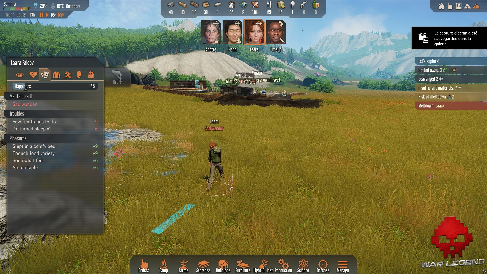 L’enthousiasme des premiers jours permettra de tenir un temps, mais sans signes de progression régulières, vos survivants commenceront à déprimer doucement, jusqu’à l’inévitable « mental breakdown » qui peut se manifester de bien des manières… et rarement des bonnes. C’est là qu’on ressent tout de suite l’influence d’un certain Rimworld, qui apporte une certaine couche d’imprévisibilité au comportement des survivants, dont l’emploi du temps et les priorités peuvent être pourtant réglés comme du papier à musique.