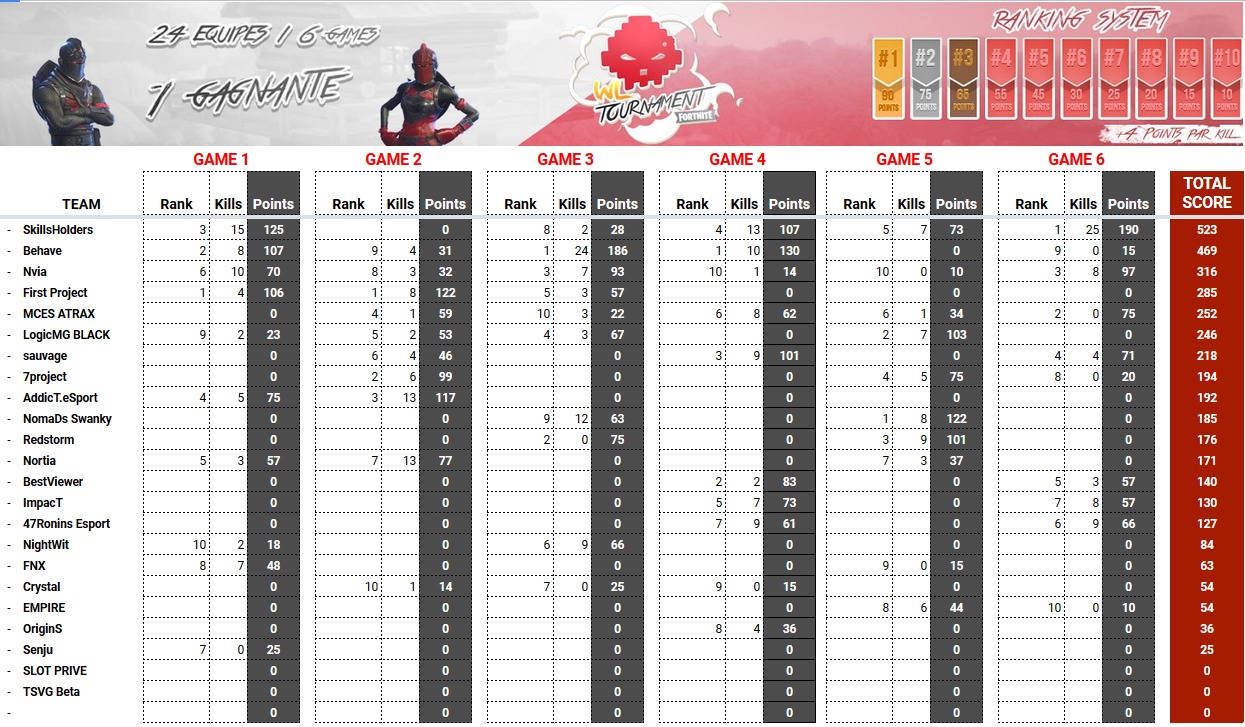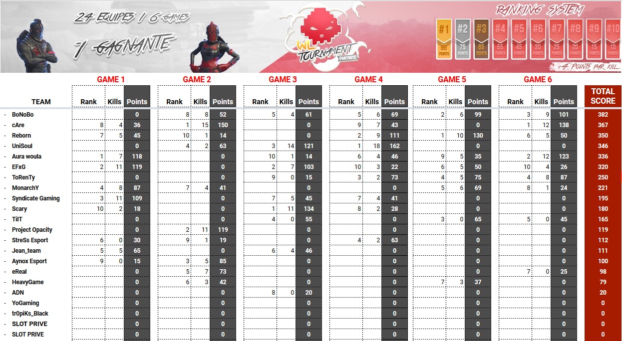 [Terminé] Tournoi War Legend Fortnite Funny Cup #12 PC Ce soir, mercredi 28 mars 2018 de 21h à 00h, venez en direct sur la WebTV WL sur ce lien. Ce tournoi est composés 48 équipes groupés sur 2 tournois ! Commençons par le Tournoi 1 (Game 6/6) : Ce tournoi est composés 48 équipes groupés sur 2 tournois ! Voyons le classement du groupe 2 (Game 6/6) : denpxc Denis "denpxc" Courtin - Fondateur de War Legend - Ancien joueur eSport - Rejoignez-moi sur mes différents réseaux sociaux :) : http://www.warlegend.net/members/denpxc | denpxc sur Youtube | denpxc sur Twitter Share This 28 mars 2018