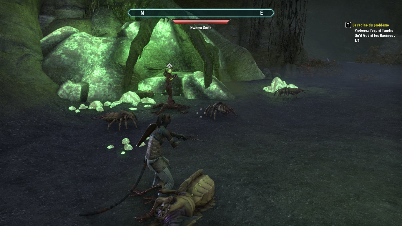 Entre la Plantation de Troussevent et le Campement de chasse de Bolga, sur les hauteurs, se trouve la Trameuse Benieth. Le Grand arbre qui assure la prospérité du domaine est malade, et l’esprit invoqué pour soigner ses racines n’est pas revenu. A vous d’aller vous aventurer dans la caverne en dessous le protéger des ennemis le temps qu’il achève sa tâche. A coté de l’entrée de la caverne, vous trouverez un éclat céleste. Plus loin dans la grotte, vous découvrez Naarwe, blessé qui vous explique qu’une portée de kwamas est entrée dans la caverne et fait ses dents sur les racines du Grand arbre. En éliminer quelques kwamas ouvriers devrait permettre à l’esprit de guérir l’arbre et ramener les plus petits à Naarwe. Dans la grotte, tuez les ouvriers pour permettre à l’esprit d’effectuer sa tâche sur les 4 racines.