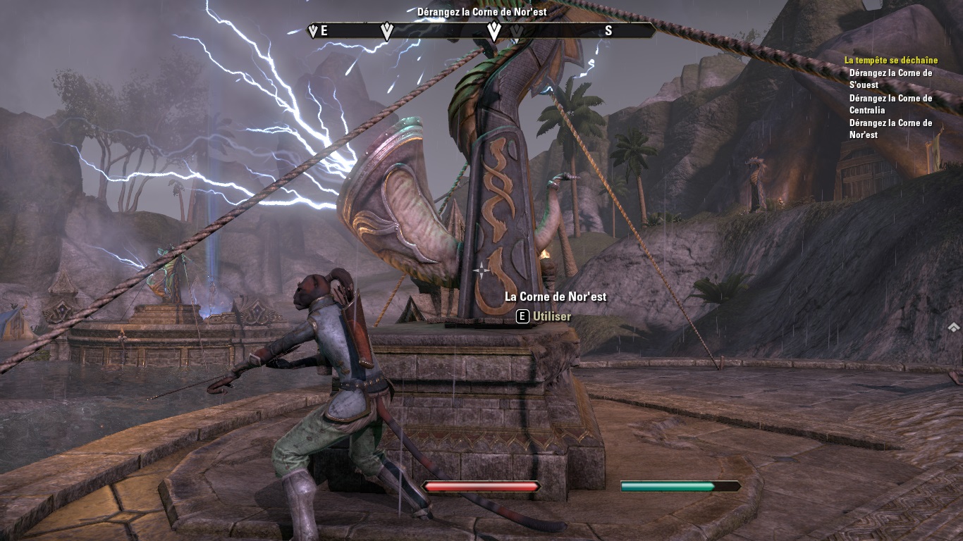Lorsque vous avez trouvé et drainé tous les totems d’orage, Ealcil vous apparaît en projection psychique pour vous expliquer le but du rituel : invoquer un Astronach de foudre. Avec la magnétite chargée, vous pouvez l’empêcher de tout dévaster sur son passage. Pour cela, vous devez déranger les cornes qui emprisonnent la créature. Pour cela vous devrez d’abord combattre un mage et un serpent géant à chaque corne. Puis fuyez le lieu du rituel pour retourner parler à Razum-dar.