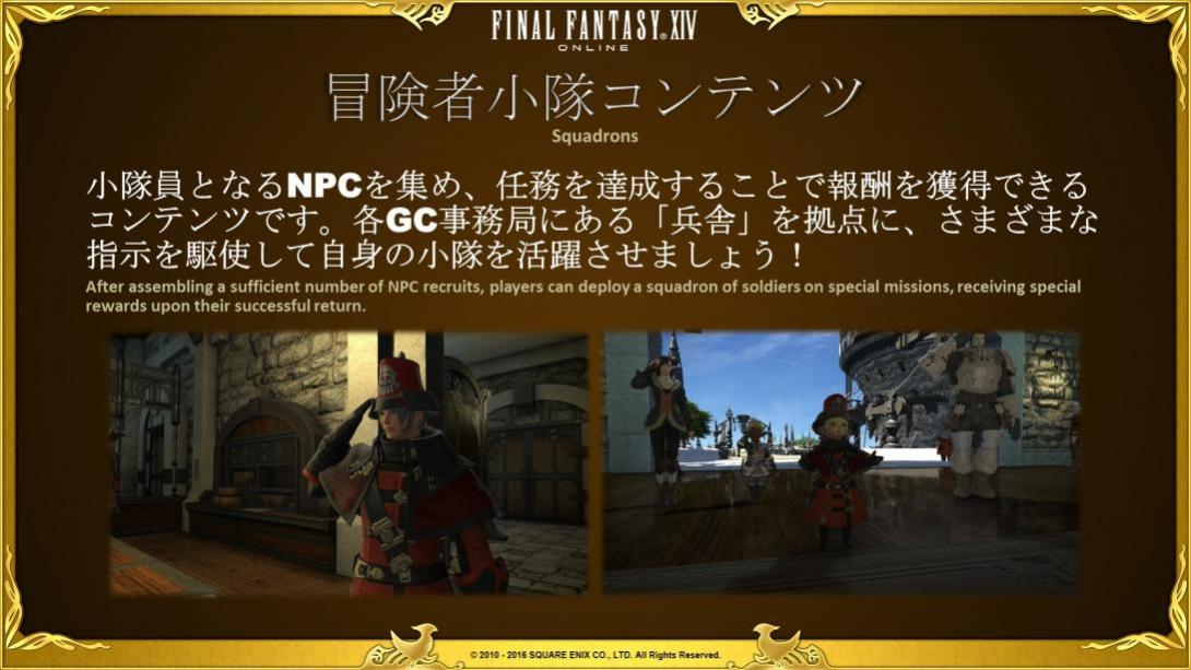 Les Escouades de grande compagnie sera un nouveau mode de jeu. Vous pourrez recruter et entrainer des personnages afin de les envoyer en mission. Un système de carnet d’objectif à atteindre vous permettra de recruter de nouveaux personnages. A l’avenir, l’équipe de développement espère qu’il sera possible d’aller en donjon avec cette escouade.